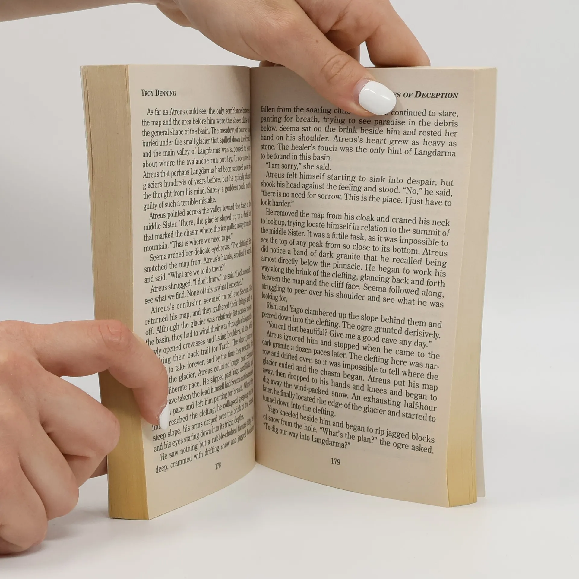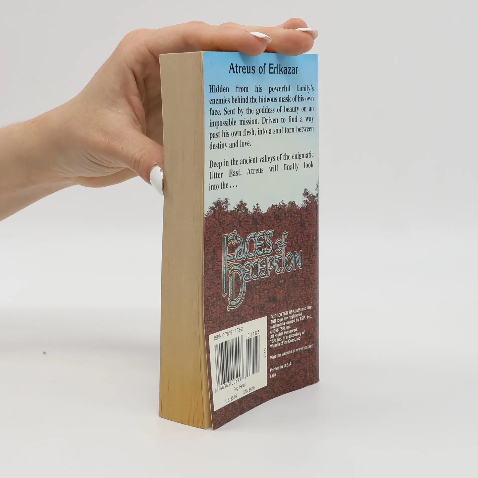 Guided by the goddess of beauty, an ugly nobleman ventures to the Utter East in search of a cure for his facial deformities Atreus of Erlkazar has always been hidden from his powerful family's enemies, concealed behind the hideous mask of his own face. The result of a wayward spell that distorted his features, Atreus’ ugliness is a curse he has borne since he was just a child—and one he has spent his entire life trying to break. He is driven to find a way past his own flesh, into a soul torn between destiny and love. In an ironic twist of fate, he becomes an acolyte of Sune, the goddess of beauty. Under her command, he embarks on an impossible mission to the mysterious country of Langdarma, where the magical waters of the Fountain of Infinite Grace await him. Deep in these ancient valleys of the enigmatic Utter East, Atreus will finally look into . . . the faces of deception.