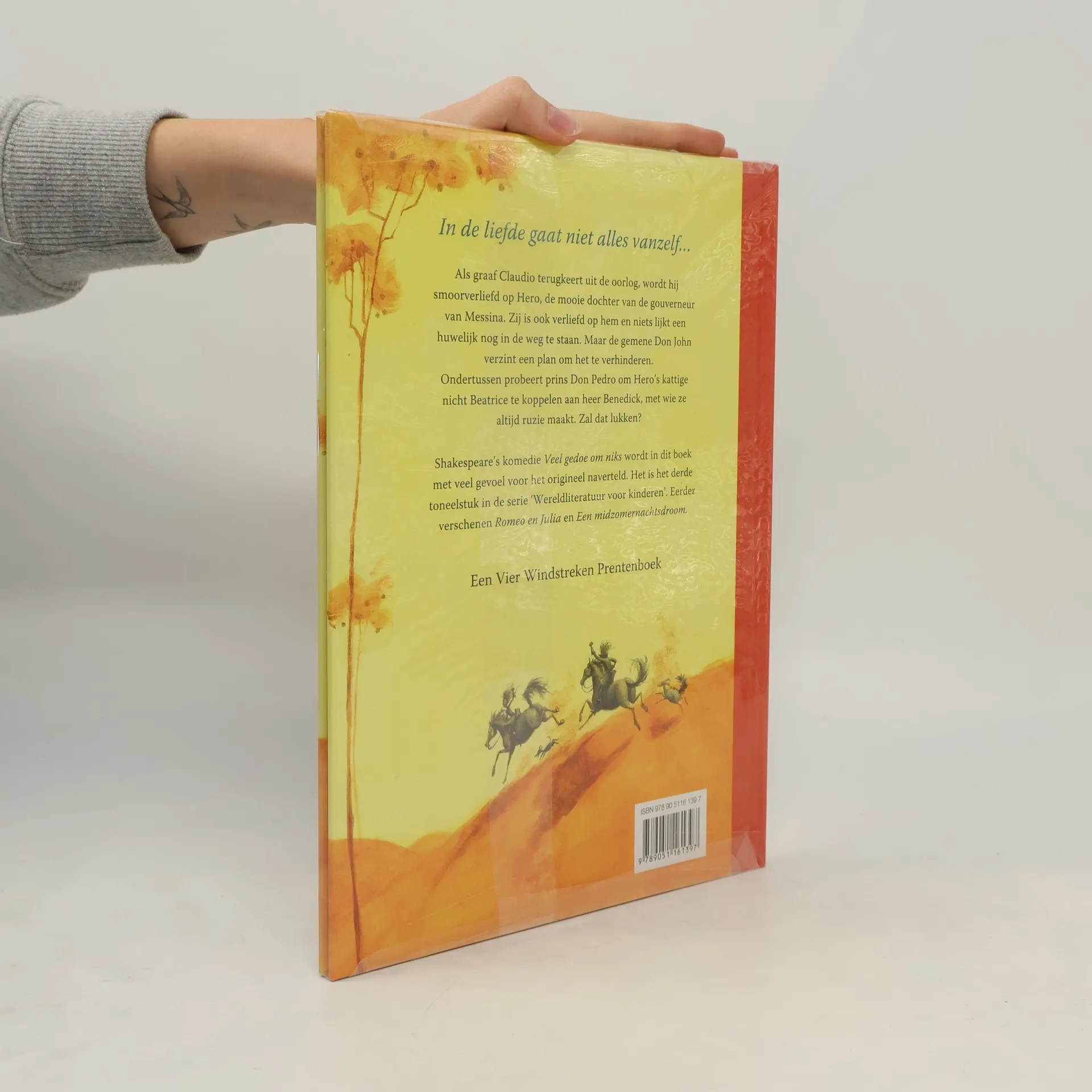 Graaf Claudio en Hero, de dochter van de gouverneur van Messina, willen gaan trouwen. Maar de gemene Don John wil dat verhinderen. Prentvertelling naar het toneelstuk van Shakespeare met sfeervolle kleurentekeningen. Vanaf ca. 10 jaar.