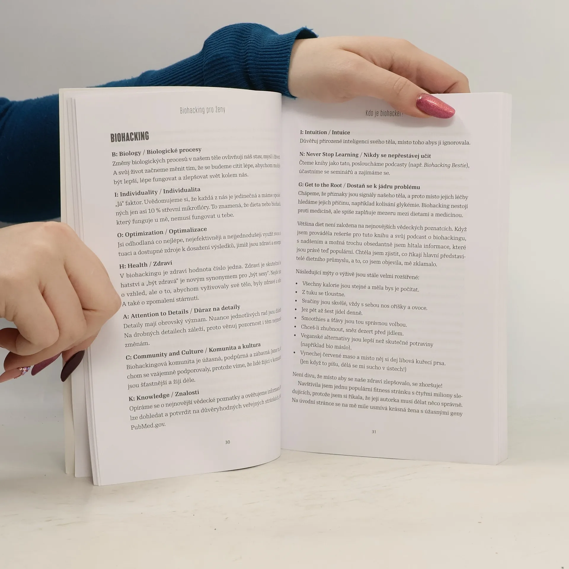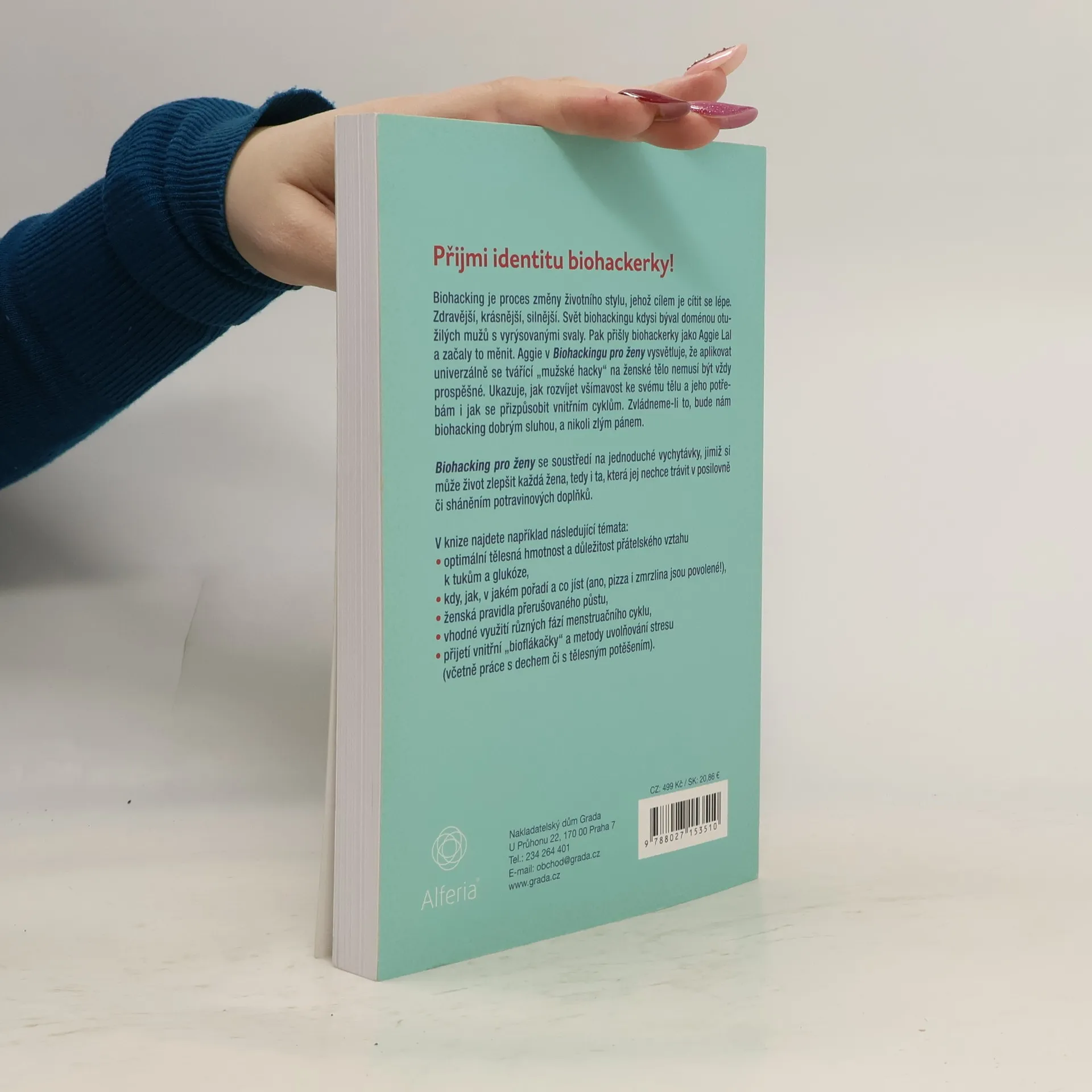 Biohacking je proces změny životního stylu, jehož cílem je cítit se lépe. Zdravější, krásnější, silnější. Svět biohackingu kdysi býval doménou otužilých mužů s vyrýsovanými svaly. Pak přišly biohackerky jako Aggie Lal a začaly to měnit. Aggie v Biohackingu pro ženy vysvětluje, že aplikovat univerzálně se tvářící „mužské hacky“ na ženské tělo nemusí být vždy prospěšné. Ukazuje, jak rozvíjet všímavost ke svému tělu a jeho potřebám i jak se přizpůsobit vnitřním cyklům. Zvládneme-li to, bude nám biohacking dobrým sluhou, a nikoli zlým pánem. Biohacking pro ženy se soustředí na jednoduché vychytávky, jimiž si může život zlepšit každá žena, tedy i ta, která jej nechce trávit v posilovně či sháněním potravinových doplňků. V knize najdeme například následující témata: optimální tělesná hmotnost a důležitost přátelského vztahu k tukům a glukóze, kdy, jak, v jakém pořadí a co jíst (ano, pizza i zmrzlina jsou povolené!), ženská pravidla přerušovaného půstu, vhodné využití různých fází menstruačního cyklu, přijetí vnitřní „bioflákačky“ a metody uvolňování stresu (včetně práce s dechem či s tělesným potěšením).