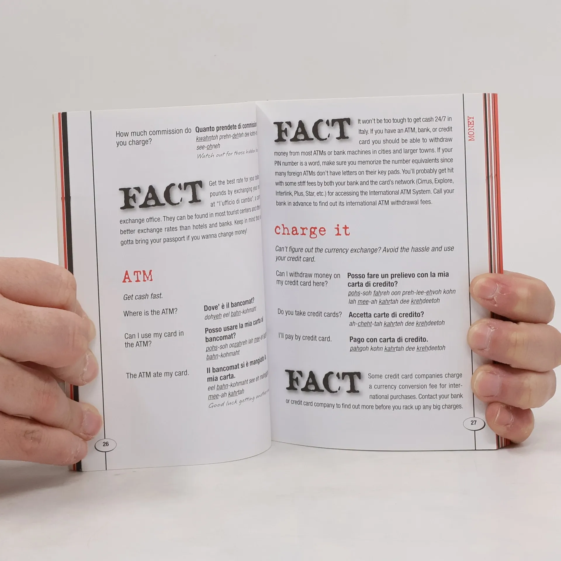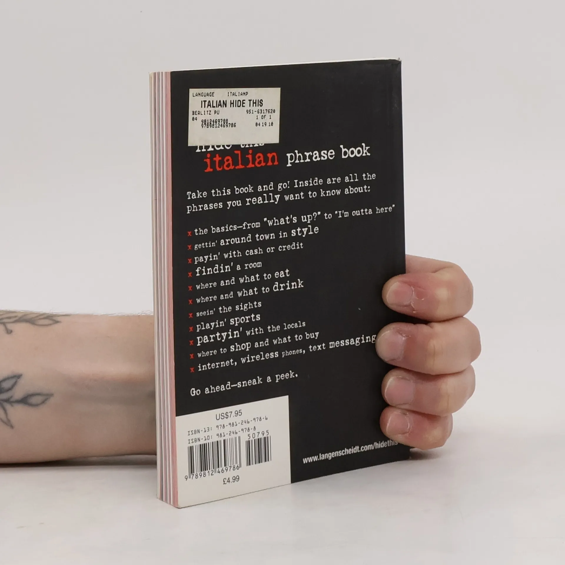 Travelers will be able to speak Italian like locals by using the easy-to-read pronunciation. Hide This Phrase Book includes conversation starters, ATM and bank info, hostel expressions, fun entertainment options, making friends with the locals and more. Also included is a two-way dictionary, featuring slang terminology.