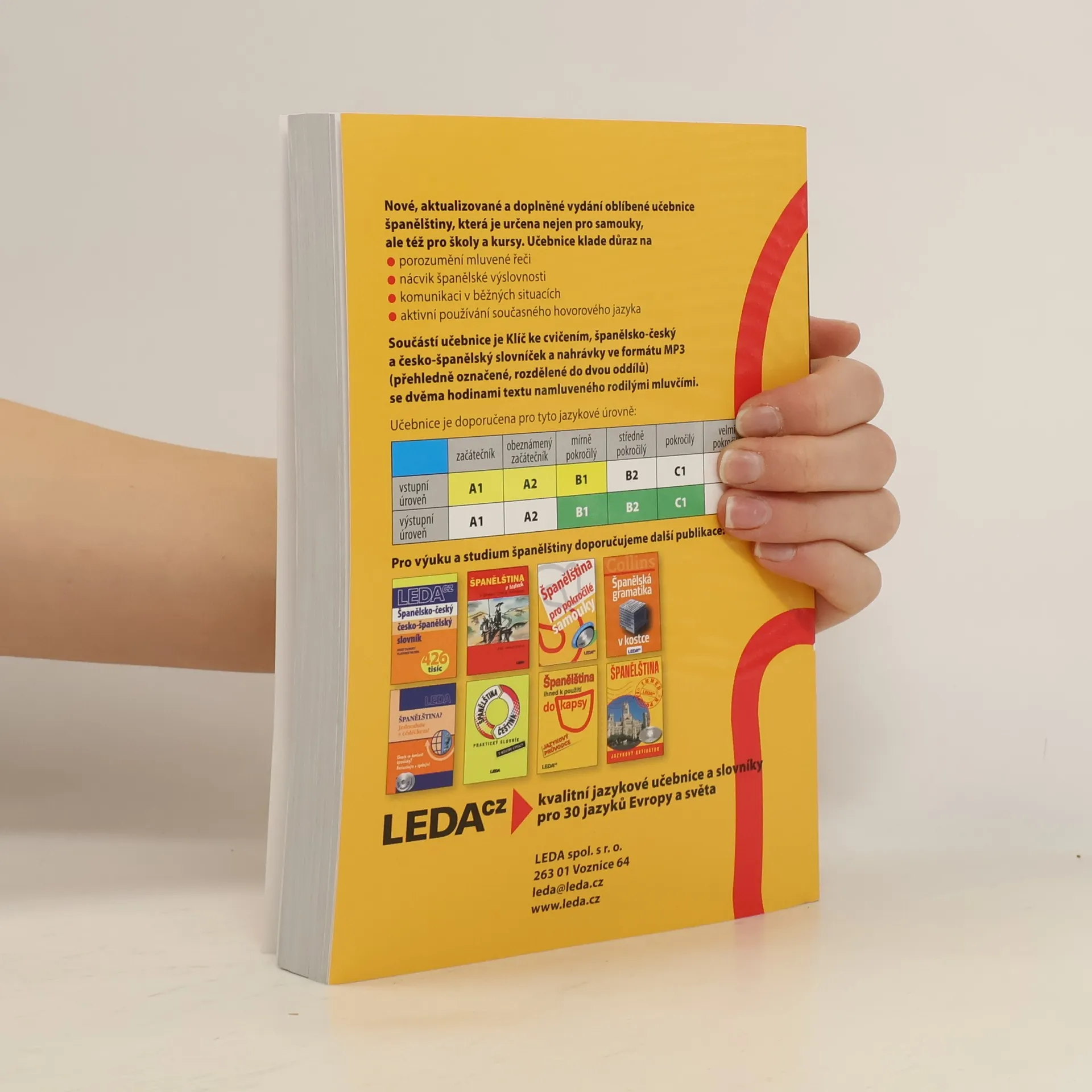 Nové, aktualizované a doplněné vydání oblíbené učebnice zaměřené na výuku evropské španělštiny (doplňkově je pozornost věnována také španělštině latinskoamerické), a to jednoduchou, přehlednou a zábavnou metodou. Ve 44 lekcích uživatel nalezne tematicky i stylisticky rozmanité texty, nejfrekventovanější slovní zásobu španělštiny a běžné frazeologismy. Gramatika je vysvětlována co nejjednodušeji a velmi přehledně a je doprovázena řadou pestrých cvičení. Formou poznámek k textu autorka seznamuje uživatele s reáliemi hispanofonních zemí. Klíč ke cvičením a závěrečný test slouží k samokontrole úspěšnosti. Učebnice je určena nejen samoukům, ale i účastníkům jazykových kursů, studentům středních škol a učilišť i těm, kdo si chtějí rozšířit či osvěžit již dříve získané znalosti španělského jazyka a používat ho v běžných životních situacích. Zvládnutí učebnice zaručuje dosažení stupně pokročilosti B2 až C1 podle doporučení Rady Evropy.