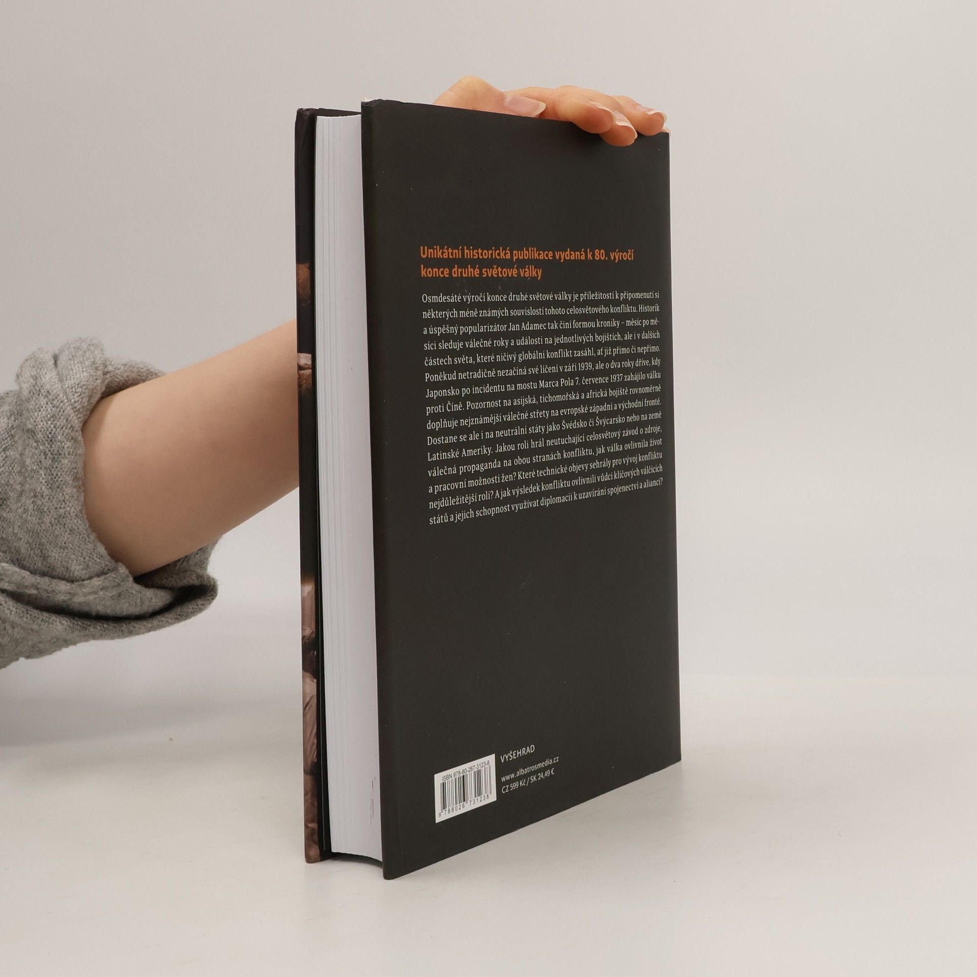 Výročí osmdesáti let od konce druhé světové války je příležitostí k připomenutí si některých méně známých souvislostí tohoto celosvětového konfliktu. Historik a úspěšný popularizátor Jan Adamec tak činí formou kroniky – měsíc po měsíci sleduje válečné roky a události na jednotlivých bojištích, ale i v dalších částech světa, které ničivý globální konflikt zasáhl. Poněkud netradičně nezačíná své líčení v září 1939, ale o dva roky dříve, kdy Japonsko po incidentu na mostu Marca Pola 7. července 1937 zahájilo válku proti Číně. Pozornost na asijská, tichomořská a africká bojiště rovnoměrně doplňuje nejznámější válečné střety na evropské západní a východní frontě. Kromě samotných válečných akcí se bohatě dostává i na diplomacii, která ani v době válečného konfliktu samozřejmě neustala. Poutavá kniha dává nahlédnout do mnoha méně známých souvislostí druhé světové války.