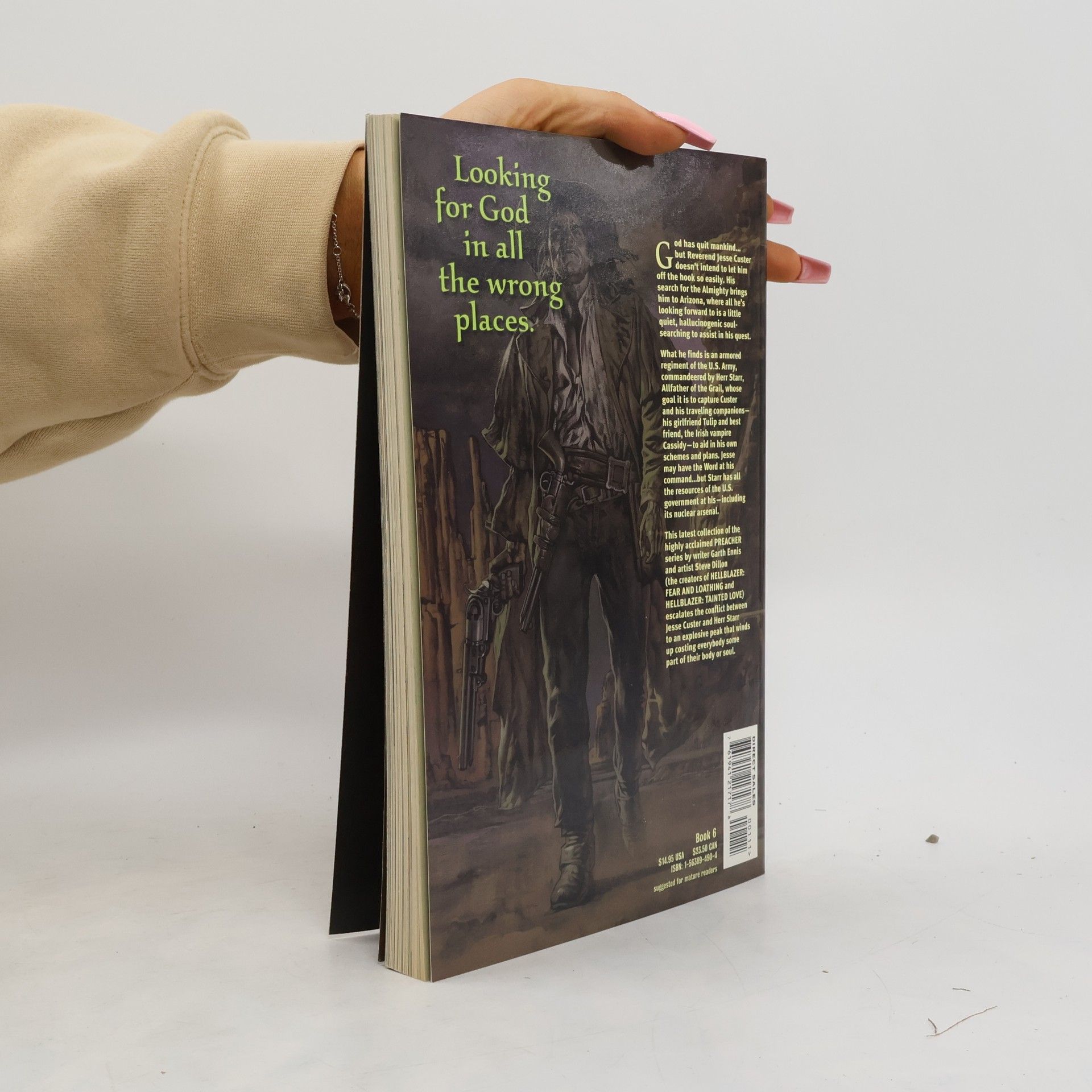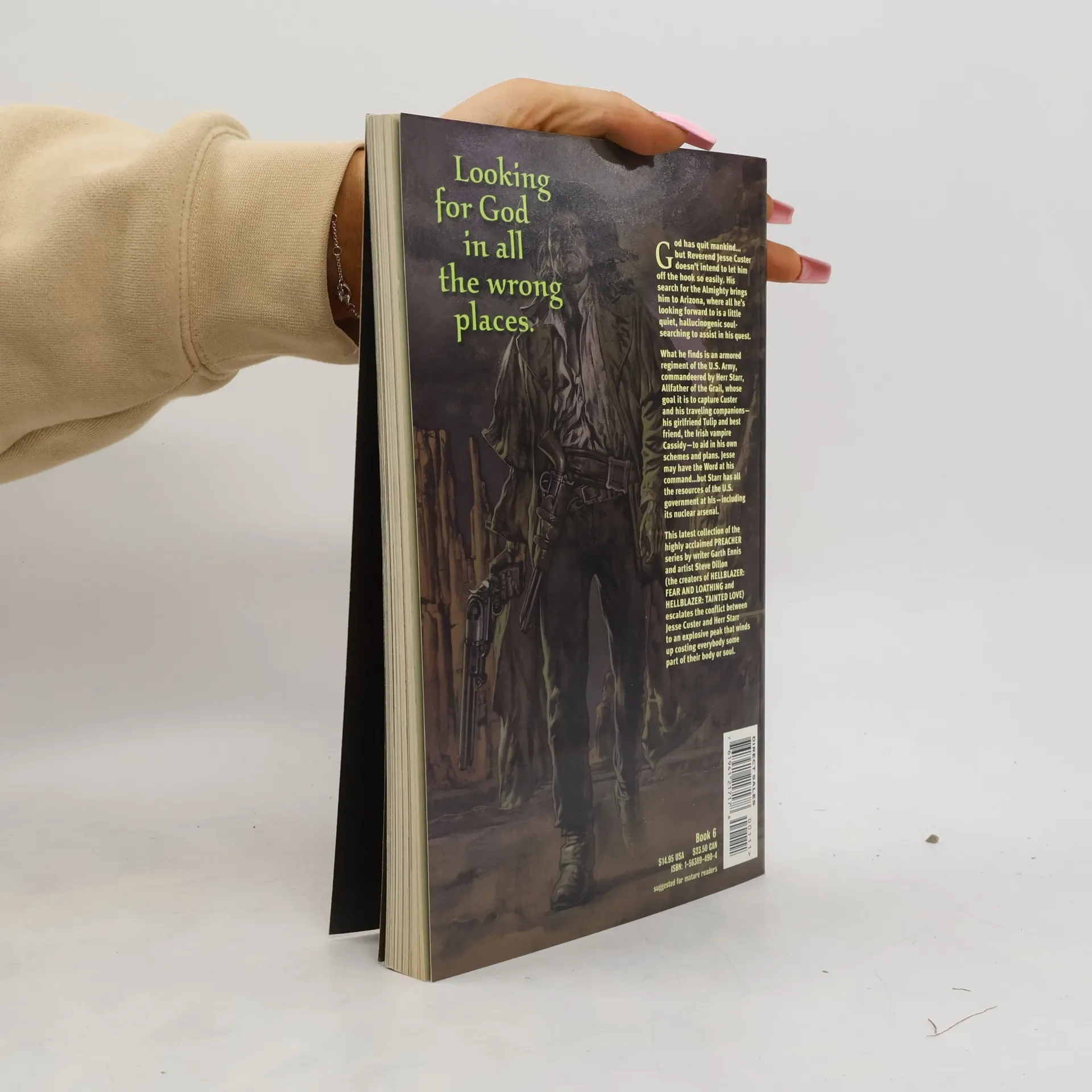 The Reverend Jesse Custer faces his deadliest challenge yet in this, the sixth Preacher collection. Jesse, along with his gun-toting girlfriend, Tulip, and the hard-drinking Irish vampire Cassidy, faces a deadly showdown in the desert with the ruthless Starr and the forces of the U.S. military -- including a nuclear warhead.Collects: Preacher #34–40, Preacher Special: One Man's War