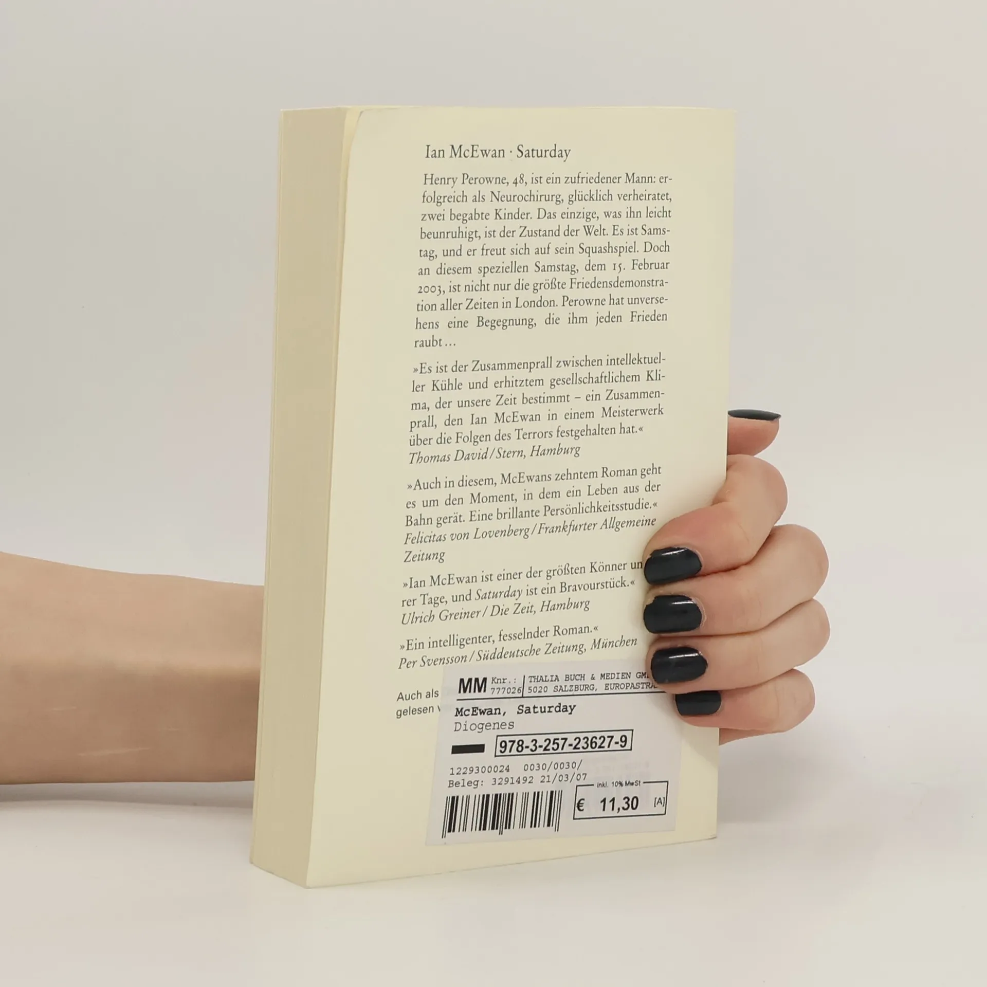 Henry Perowne, 48, ist ein zufriedener Mann: erfolgreich als Neurochirurg, glücklich verheiratet, zwei begabte Kinder. Das einzige, was ihn leicht beunruhigt, ist der Zustand der Welt. Es ist Samstag, und er freut sich auf sein Squashspiel. Doch an diesem speziellen Samstag, dem 15. Februar 2003, ist nicht nur die größte Friedensdemonstration aller Zeiten in London. Perowne hat unversehens eine Begegnung, die ihm jeden Frieden raubt