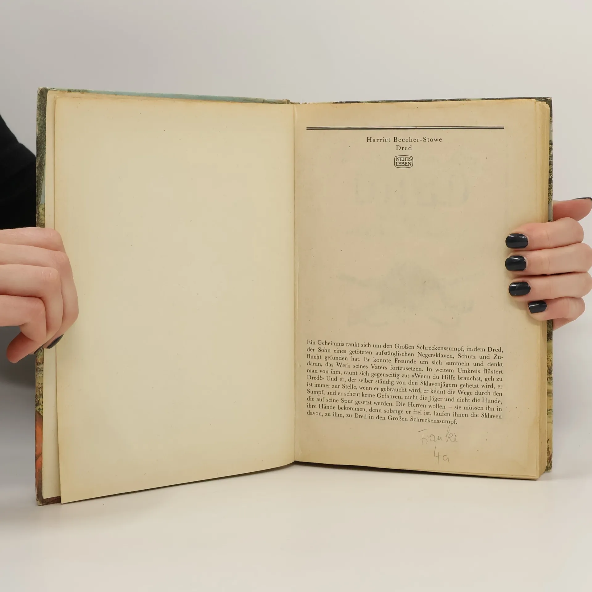 Ein Geheimnis rankt sich um den Großen Schreckenssumpf, in dem Dred, der Sohn eines getöteten aufständischen Negersklaven, Schutz und Zuflucht gefunden hat. Er konnte Freunde um sich sammeln und denkt daran, das Werk seines Vaters fortzusetzen. In weitem Umkreis flüstert man von ihm, raunt sich gegenseitig zu: "Wenn du Hilfe brauchst, geh zu Dred!" Und er, der selber ständig von den Sklavenjägern gehetzt wird, er ist immer zur Stelle, wenn er gebraucht wird, er kennt die Wege durch den Sumpf, und er scheut keine Gefahren, nicht die Jäher und nicht die Hunde, die auf seine Spur gesetzt werden. Die Herren wollen - sie müssen ihn in ihre Hände bekommen, denn solange er frei ist, laufen ihnen die Sklaven davon, zu ihm, zu Dred in den Großen Schreckenssumpf. Unter Verwendung zweier Übersetzungen aus dem Amerikanischen von Marie Heine (Leipzig, 1856) und August Kretzschmar (Wurzen 1857) bearbeitet von Jörg Hildebrandt. Gekürzte Fassung.