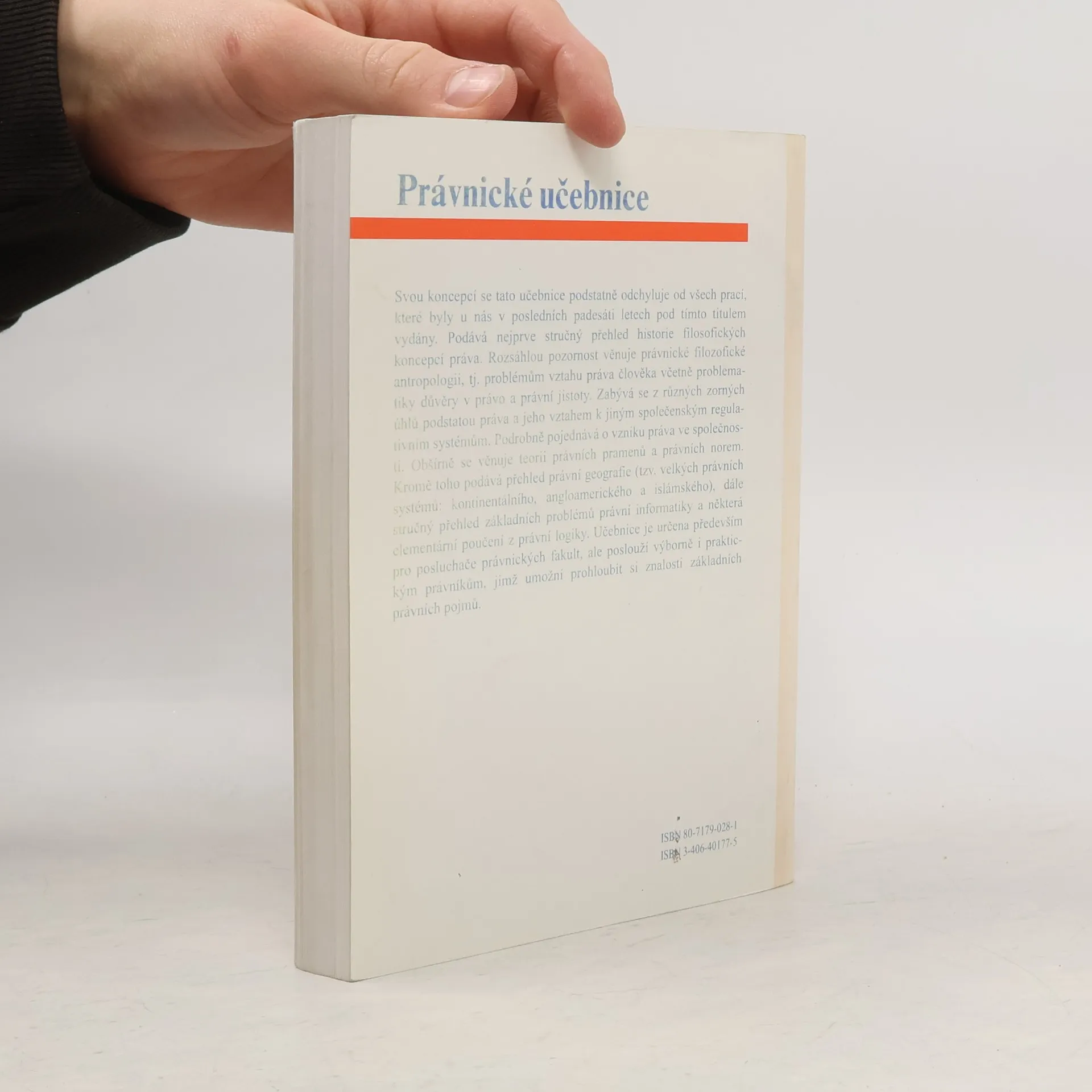 Svou koncepcí se tato učebnice podstatně odchyluje od všech prací, které byly u nás v posledních padesáti letech pod tímto titulem vydány. Podává nejprve stručný přehled historie filosofických koncepcí práva. Rozsáhlou pozornost věnuje právnické filozofické antropologii, tj. problémům vztahu práva člověka včetně problematiky důvěry v právo a právní jistoty. Zabývá se z různých zorných úhlů podstatou práva a jeho vztahem k jiným společenským regulativním systémům. Podrobně pojednává o vzniku práva ve společnosti.