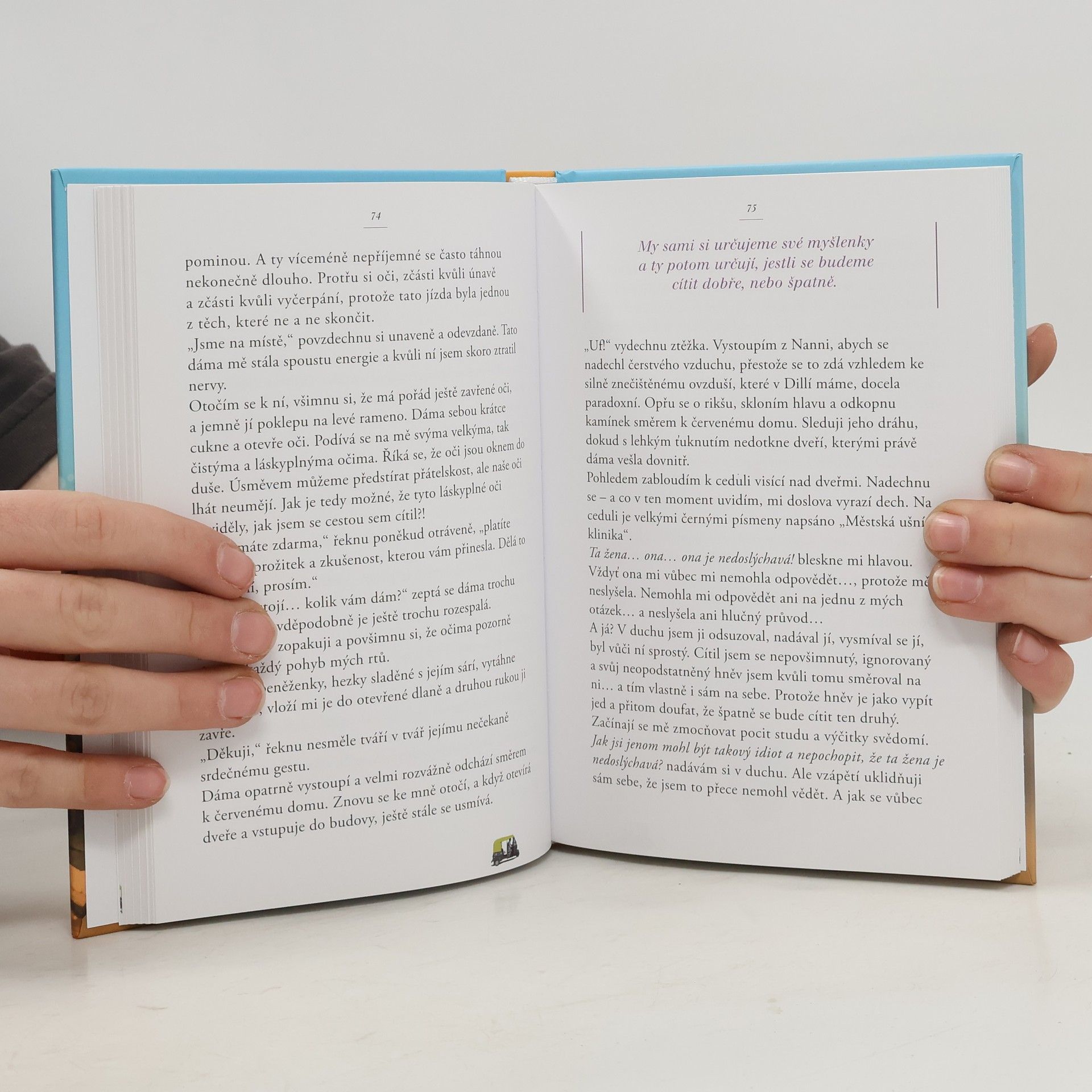 Každý z nás někdy touží, aby mu někdo jen tiše řekl: „Jsi v pořádku. Všechno bude dobré.“Indický rikša Rahul vozí cestující ulicemi Nového Dillí – a mění jejich životy. Mluví s nimi o věcech, které jsme možná zapomněli: o přítomném okamžiku, vděčnosti, odvaze být sám sebou. V jeho barevné rikše s blikajícími světýlky si lidé neobjednávají jen jízdu – ale malou cestu zpátky k sobě.Neobyčejně lidská a vtipná kniha plná příběhů, které zahřejí, rozesmějí i rozpláčou. Rahul nás učí, že štěstí není někde daleko – ale začíná rozhodnutím: dnes mít dobrý den.
