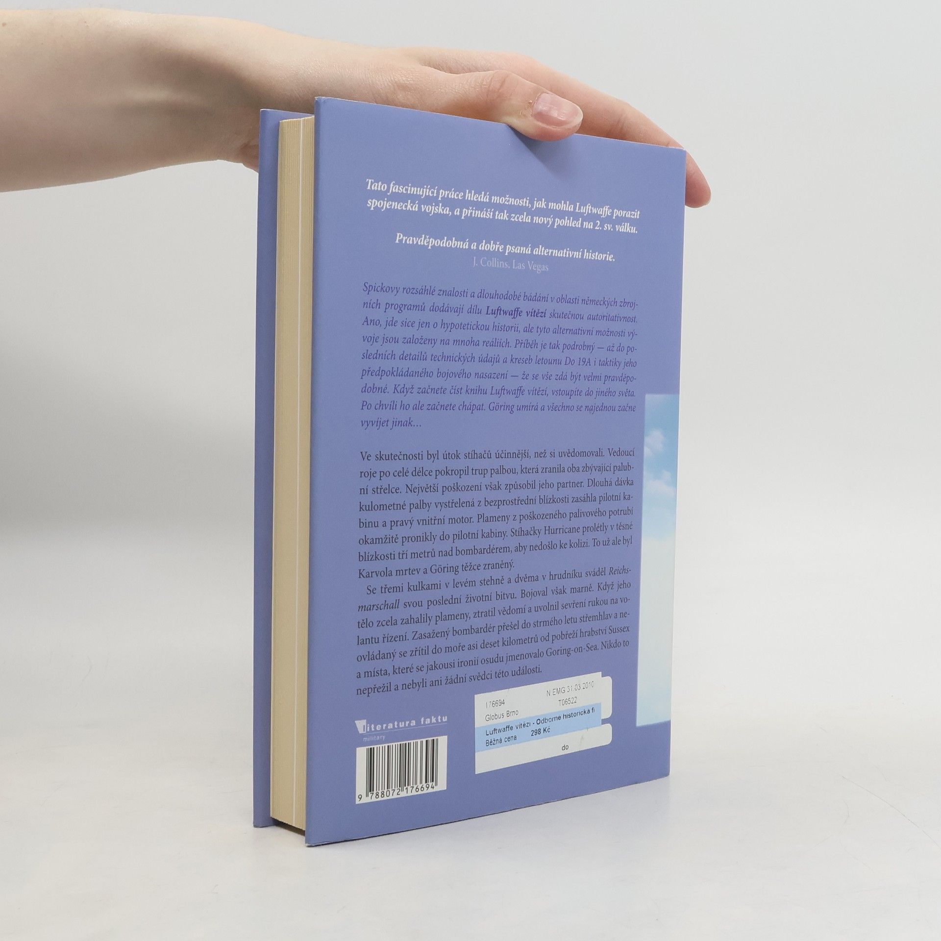 Smyšlený, značně hypotetický průběh a závěr II. světové války; úvahy (spekulace) o možnostech a výraznější roli Luftwaffe bez Hermanna Göringa v čele... Vcelku erudovaný autor nabízí čtenářům poměrně čtivou sci-fi ("co by kdyby") o téměř všemocné německé Luftwaffe. Říšského maršála H. Göringa nechává v tomto příběhu umřít již 7. září 1940 během letecké bitvy o Británii. Do čela a na rozhodující místa Luftwaffe se dostávají jiné (skutečné), profesionálně velmi zdatné osobnosti, které se vyvarují mnoha chyb Göringa a spol. Luftwaffe se ve vývoji nových typů letadel i na bojištích opravdu překonává, ale nedokáže zabránit západním Spojencům ve svržení atomové bomby na Mnichov v srpnu roku 1945... Další fiktivní příběhy či zamyšlení na blízké téma mohou čtenáři najít např. také v knize Kennetha Mackseye Hitlerovy možnosti (signatura W 1705). Fotografie, seznam použité literatury.