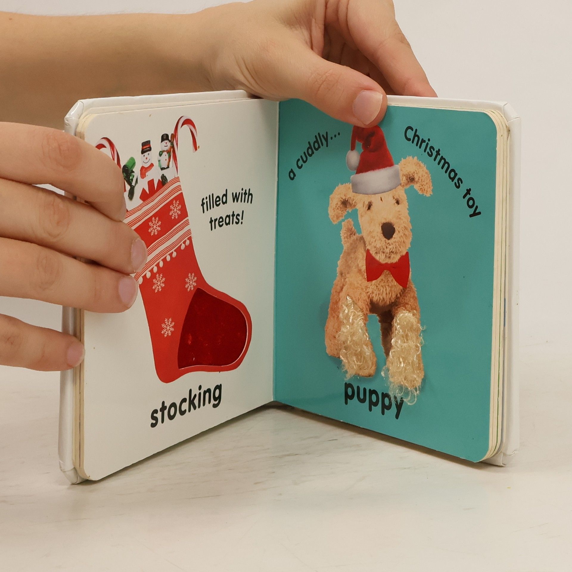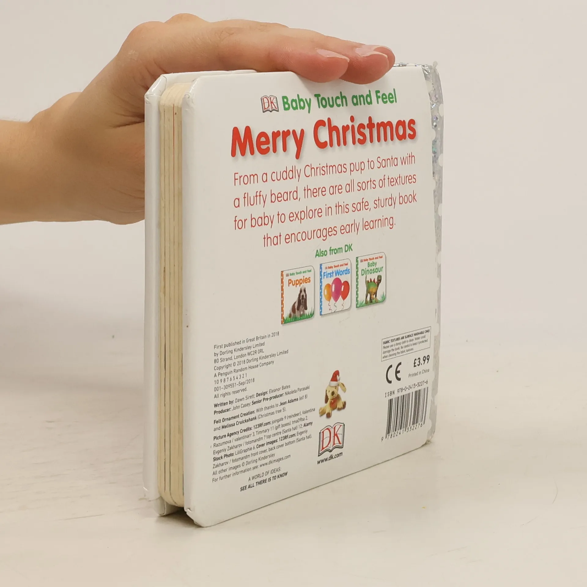 Just right for sharing with babies and toddlers, inside you meet jolly characters and Christmassy things, all with touch and feel patches or sparkly areas to explore. There's a toy snowman with a fleecy scarf, a toy robin with a fluffy red breast, a sparkly Christmas tree, a toy reindeer with bumpy antlers, a toy elf with glittery clothes, a silky Christmas sack filled with presents, and Santa with a soft white beard. Filled with early learning, every page of Baby Touch and Feel Merry Christmas has texture or an eye-catching shiny area to expand a baby's senses, and the simple design (with one main picture per page) is easy for very young children to follow. There are clear, real-life photos babies and toddlers can focus on, which help their identification skills, large word labels that build vocabulary and picture-and-word association (helpful for early reading), plus short, read-aloud text with each picture that's great for encouraging little ones to talk, promoting their language. This small baby board book is a good size for little hands to hold. Babies and toddlers will love turning the tough pages themselves, which develops their fine motor skills