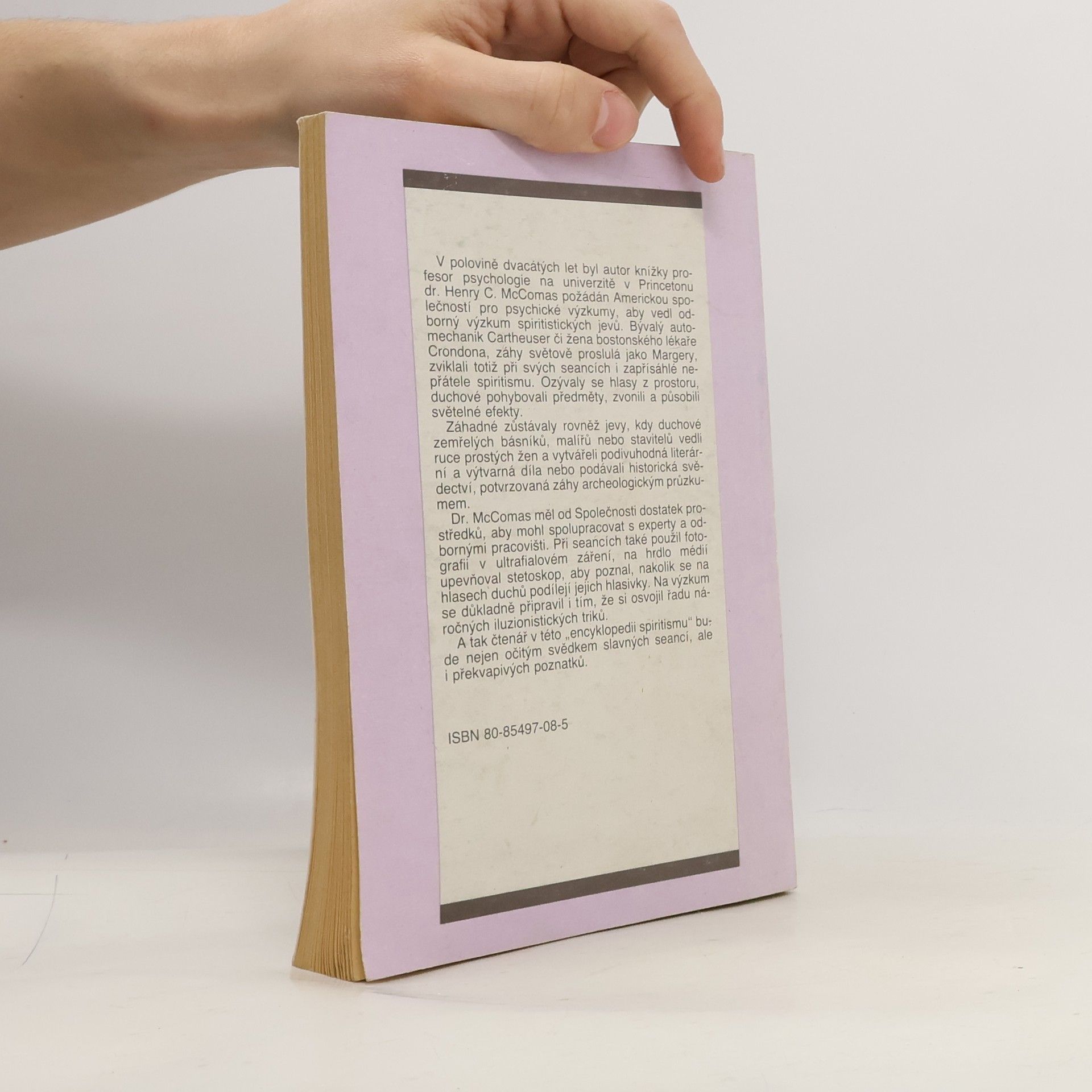 V polovině dvacátých let byl autor knížky profesor psychologie na univerzitě v Princetonu dr. Henry C. McComas požádán Americkou společností pro psychické výzkumy, aby vedl odborný výzkum spiritistických jevů. Bývalý automechanik Cartheuser či žena bostonského lékaře Crondona, záhy světově proslulá jako Margery, zviklali totiž při svých seancích i zapřísáhlé nepřátele spiritismu. Ozývaly se hlasy z prostoru, duchové pohybovali předměty, zvonili a působili světelné efekty. Záhadné zůstávaly rovněž jevy, kdy duchové zemřelých básníků, malířů nebo stavitelů vedli ruce prostých žen a vytvářeli podivuhodná literární a výtvarná díla nebo podávali historická svědectví, potvrzovaná záhy archeologickým průzkumem. Dr. McComas měl od Společnosti dostatek prostředků, aby mohl spolupracovat s experty a odbornými pracovišti. Při seancích také použil fotografii v ultrafialovém záření, na hrdlo médií upevňoval stetoskop, aby poznal, nakolik se na hlasech duchů podílejí jejich hlasivky. Na výzkum se důkladně připravil i tím, že si osvojil řadu náročných iluzionistických triků. A tak čtenář v této „encyklopedii spiritismu" bude nejen očitým svědkem slavných seancí, ale i překvapivých poznatků.