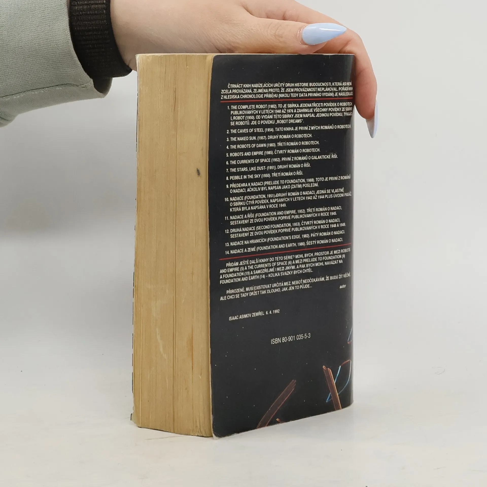 První ze série sci-fi románů o Nadaci. Hlavním tématem je vznik teorie psychohistorie, která má uchránit lidstvo před zánikem. Román byl napsán jako poslední, ale časově se odehrává před ostatními pěti romány o Nadaci. Děj se odvíjí na planetě Trantor, kde matematik Seldon objeví teorii psychohistorie, která umožňuje předvídat a řídit další vývoj lidstva. Zájem vládců využít tento objev ve svůj prospěch se střetává s vůlí Seldona uchránit lidskou civilizaci před zánikem. V této jeho snaze mu účinně pomáhá inteligentní robot. ... celý text