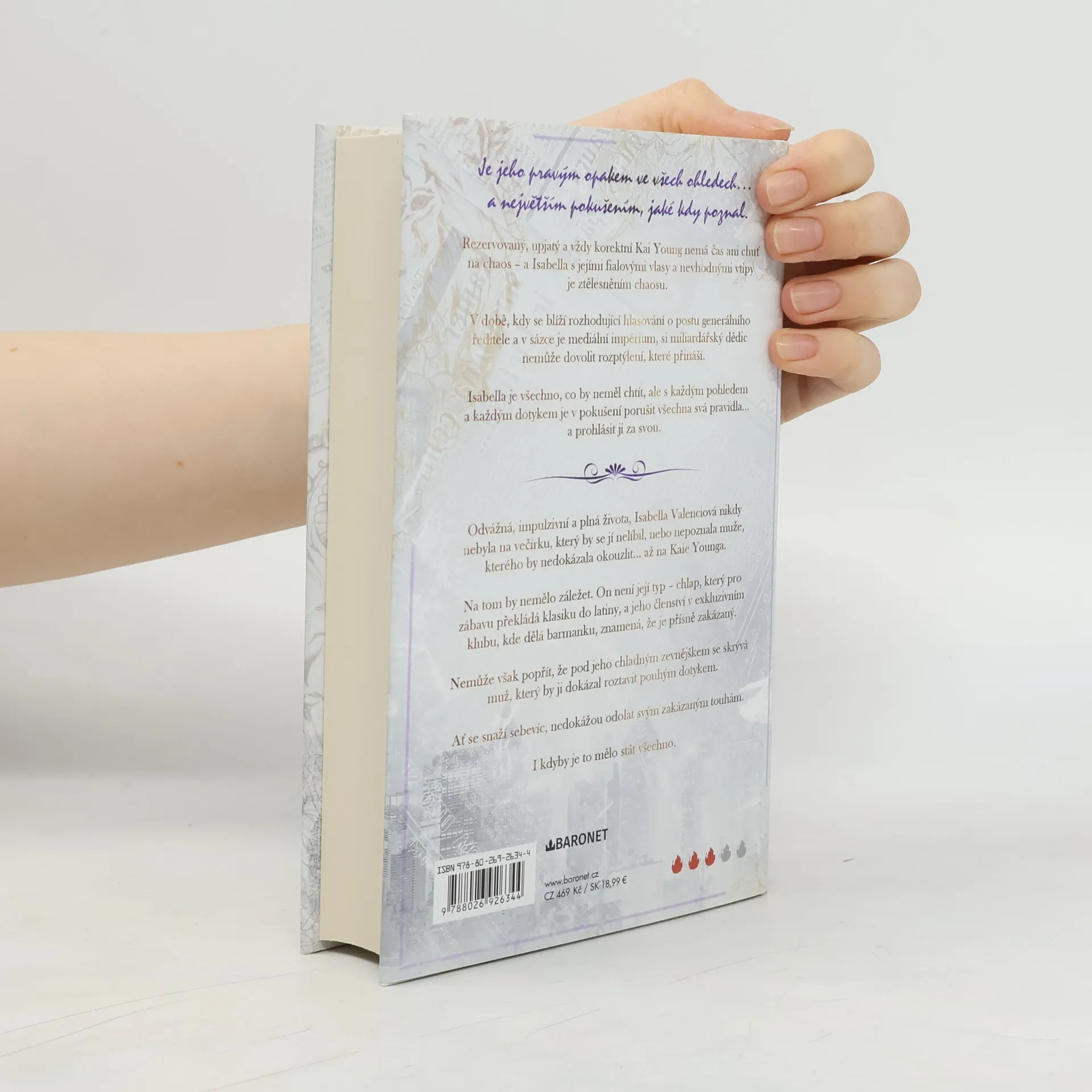 Zakázaná přitažlivost ve světě miliardářů. Rezervovaný, upjatý a vždy korektní Kai Young nemá čas ani chuť na chaos – a Isabella s jejími fialovými vlasy a nevhodnými vtipy je ztělesněním chaosu.V době, kdy se blíží rozhodující hlasování o postu generálního ředitele a v sázce je mediální impérium, si miliardářský dědic nemůže dovolit rozptýlení, které přináší.Isabella je všechno, co by neměl chtít, ale s každým pohledem a každým dotykem je v pokušení porušit všechna svá pravidla... a prohlásit ji za svou.Odvážná, impulzivní a plná života, Isabella Valenciová nikdy nebyla na večírku, který by se jí nelíbil, nebo nepoznala muže, kterého by nedokázala okouzlit... až na Kaie Younga.Na tom by nemělo záležet. On není její typ – chlap, který pro zábavu překládá klasiku do latiny, a jeho členství v exkluzivním klubu, kde dělá barmanku, znamená, že je přísně zakázaný.Nemůže však popřít, že pod jeho chladným zevnějškem se skrývá muž, který by ji dokázal roztavit pouhým dotykem.Ať se snaží sebevíc, nedokážou odolat svým zakázaným touhám.I kdyby je to mělo stát všechno.