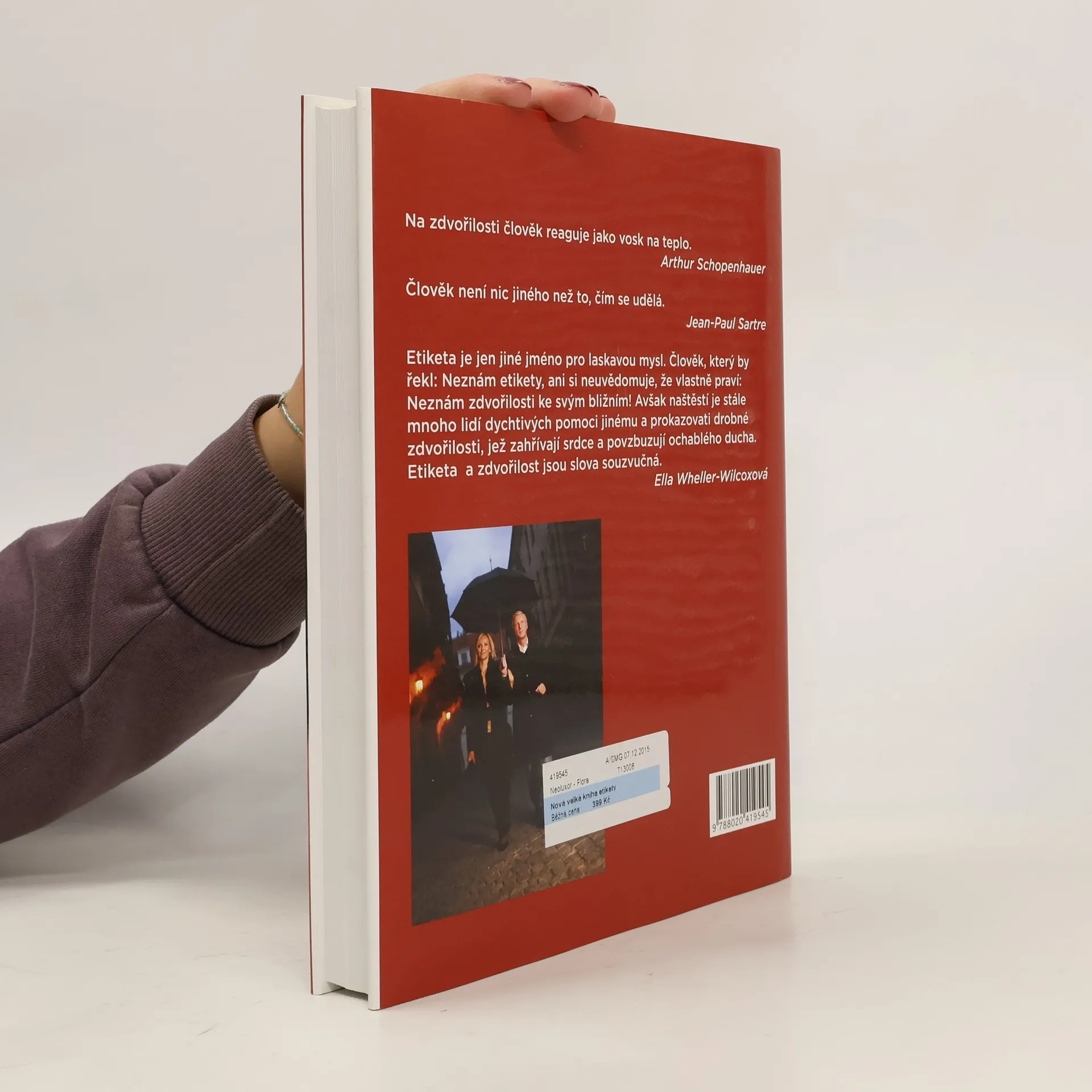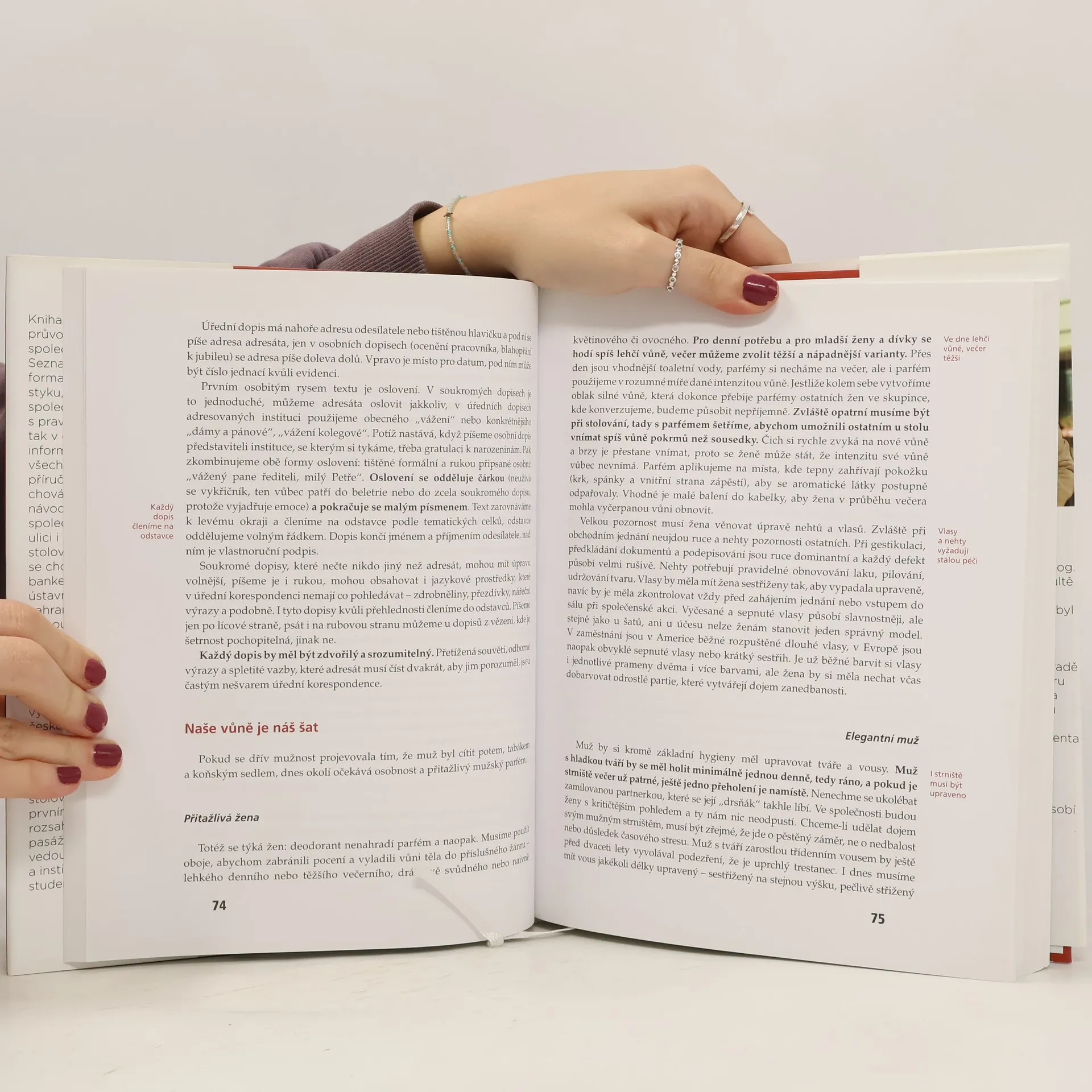 Kniha je univerzálním průvodcem různými společenskými událostmi. Seznamuje čtenáře se všemi formami společenského styku, se správným řešením společenských situací, s pravidly jednání jak doma, tak v cizině. Množstvím informací a rad překonává všechny dosud vydané příručky společenského chování. Poskytuje praktické návody, jak se chovat ve společnosti, v kanceláři, na ulici i doma, jak správně stolovat, jak se oblékat, jak se chovat na recepci, na banketu, jak připravit návštěvu ústavního činitele, jak jednat se zahraničními partnery. Vychází ze soudobého pojetí etikety a protokolu. Je nezbytnou pomůckou pro školu, úřad, firmu i rodinu. Druhé, doplněné a rozšířené vydání reaguje na změny, jimiž česká společnost prochází. Je obohaceno o nové trendy v oblékání, o další typy společenských příležitostí, o rozšířený přehled forem stolování. Kniha má oproti prvnímu vydání dvojnásobný rozsah. Doplněné a rozšířené pasáže přivítají manažeři, vedoucí pracovníci úřadů a institucí, diplomaté, učitelé, studenti a rodiče.