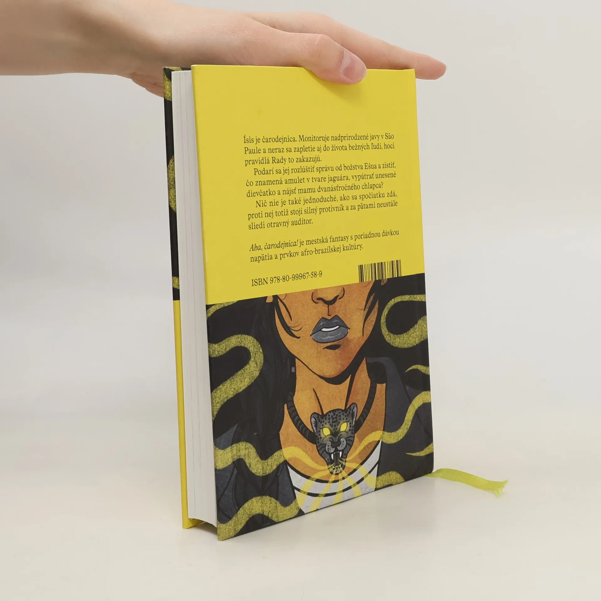 Ísis je čarodejnica. Monitoruje nadprirodzené javy v São Paule a neraz sa zapletie aj do života bežných ľudí, hoci pravidlá Rady to zakazujú. Podarí sa jej rozlúštiť správu od božstva Ešua a zistiť, čo znamená amulet v tvare jaguára, vypátrať unesené dievčatko a nájsť mamu dvanásťročného chlapca? Nič nie je také jednoduché, ako sa spočiatku zdá, proti nej totiž stojí silný protivník a za pätami neustále sliedi otravný audítor. Aha, čarodejnica! je mestská fantasy s poriadnou dávkou napätia a prvkov afro-brazílskej kultúry.