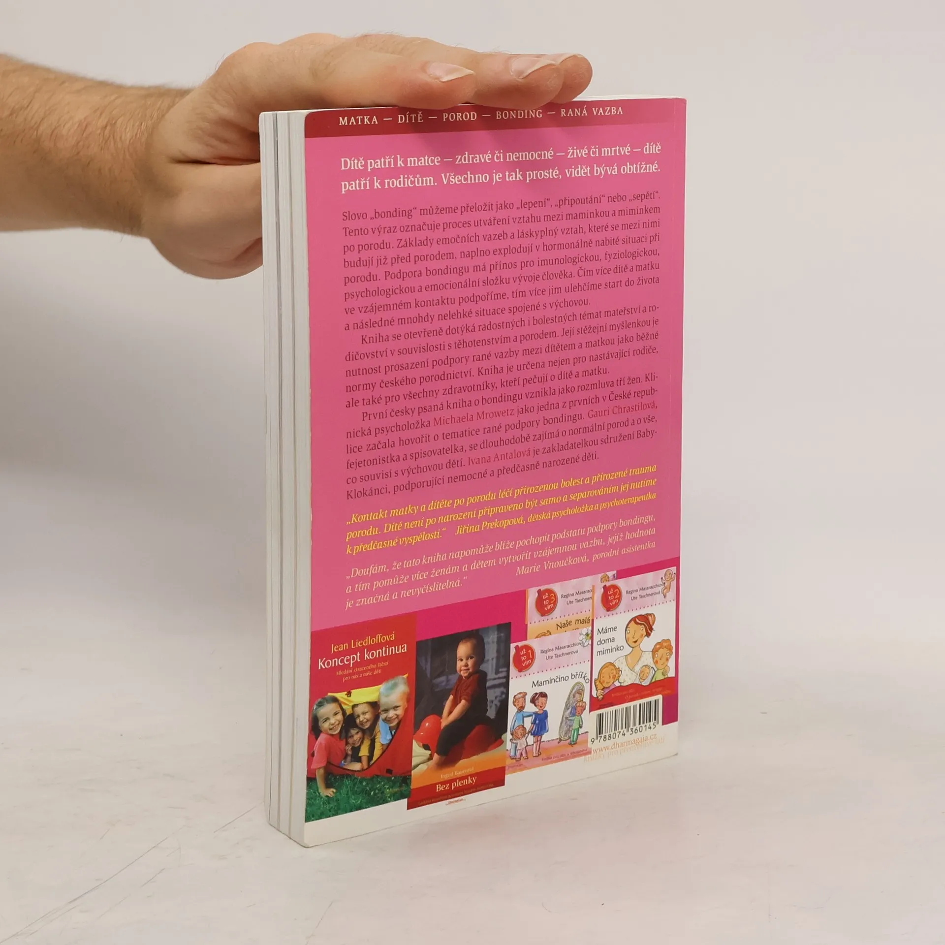 Kniha vznikla jako rozmluva tří žen: klinické psycholožky Michaely Mrowetz, zakladatelky sdružení BabyKlokánci Ivany Antalové a fejetonistky Gauri Chrastilové. Autorky se snažily vytvořit dílo, které by jim pomohlo během jejich prvního těhotenství, a otevřeně se dotýkají jak radostných, tak bolestných témat mateřství a rodičovství. Publikace odborně a srozumitelně zpracovává širokou škálu témat, přičemž klade důraz na nutnost podpory rané vazby mezi matkou a dítětem jako běžné normy českého porodnictví. Kniha obsahuje příběhy, kasuistiky, stanoviska odborníků a šedesátistránkovou barevnou obrazovou přílohu. Je určena především laické veřejnosti, ale přináší cenné informace i zdravotníkům, kteří pracují s ženami v období kolem porodu. V textu se zdůrazňuje, že kontakt matky a dítěte po porodu léčí přirozenou bolest a trauma spojené s porodem, a že dítě není po narození připraveno být samo. Podpora bondingu, tedy procesu utváření vztahu mezi matkou a miminkem, má významný přínos pro jejich imunologický, fyziologický a psychologický vývoj. Kniha se tak stává cenným zdrojem pro nastávající rodiče i odborníky, kteří se zabývají péčí o matku a dítě.