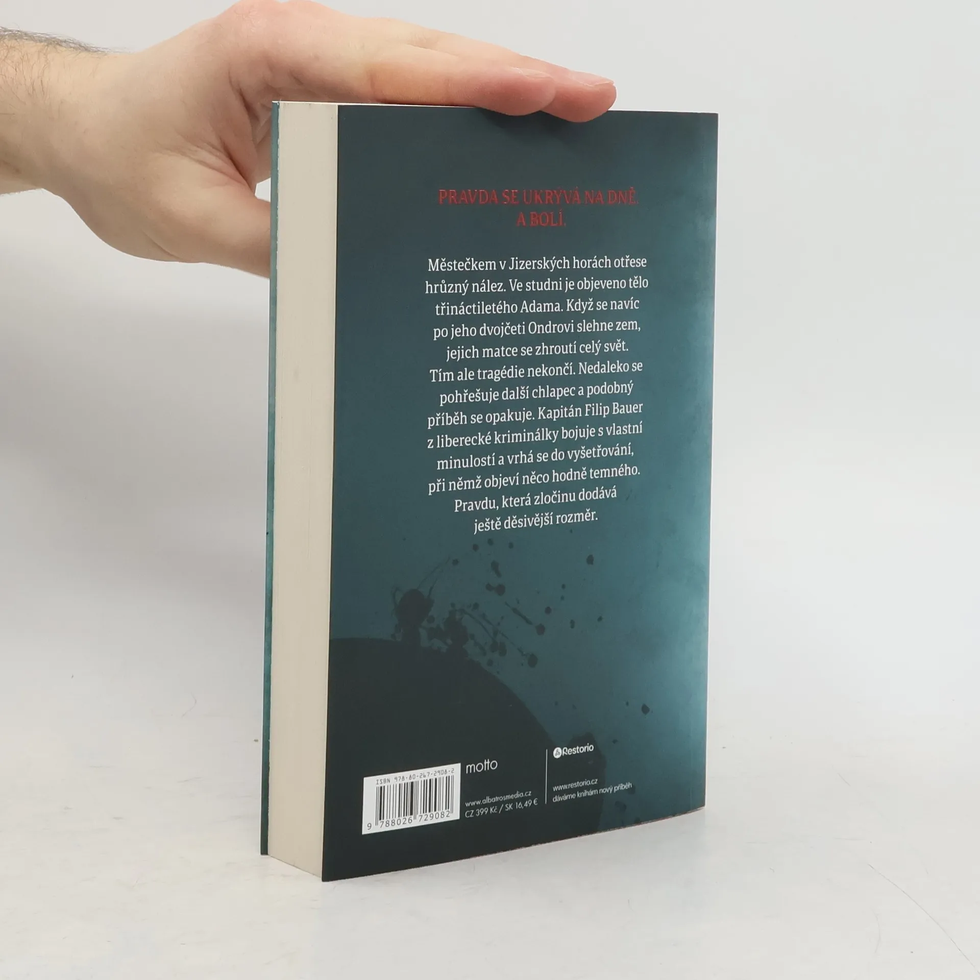 Městečkem v Jizerských horách otřese hrůzný nález. Ve studni je objeveno tělo třináctiletého Adama. Když se navíc po jeho dvojčeti Ondrovi slehne zem, jejich matce se zhroutí celý svět. Tím ale tragédie nekončí. Nedaleko se pohřešuje další chlapec a podobný příběh se opakuje. Kapitán Filip Bauer z liberecké kriminálky bojuje s vlastní minulostí a vrhá se do vyšetřování, při němž objeví něco hodně temného. Pravdu, která zločinu dodává ještě děsivější rozměr.