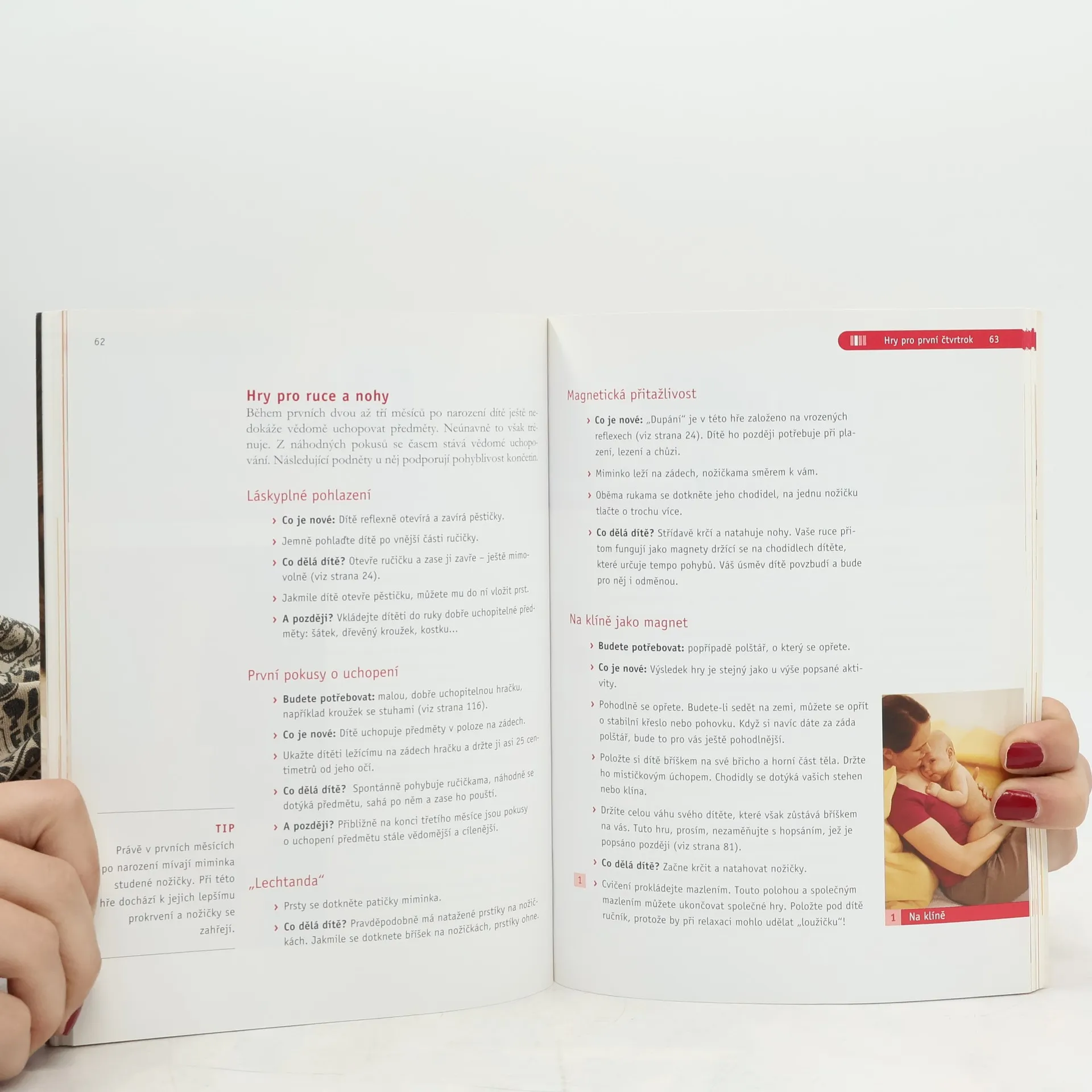 Program cvičení rodičů s dětmi do jednoho roku. Děti potřebují lásku, něhu a vhodné podněty, aby se mohly optimálním způsobem rozvíjet. Přinášíme vám program cvičení rodičů s dětmi, který můžete snadno realizovat doma. Všechna cvičení podporují aktivitu vašeho děťátka a zprostředkovávají mu pocit: „Už to dokážu sám!“. Nejkrásnější hry: V této knize najdete více než stovku nekrásnějších her a pohybových aktivit, kterým se můžete se svou ratolestí věnovat doma. S dítětem si tedy můžete začít hrát hned po narození. Získáte tak nezapomenutelné zážitky. Hračky: Zjistíte, jak lze velmi rychle a jednoduše vyrobit krásné a podnětné hračky.