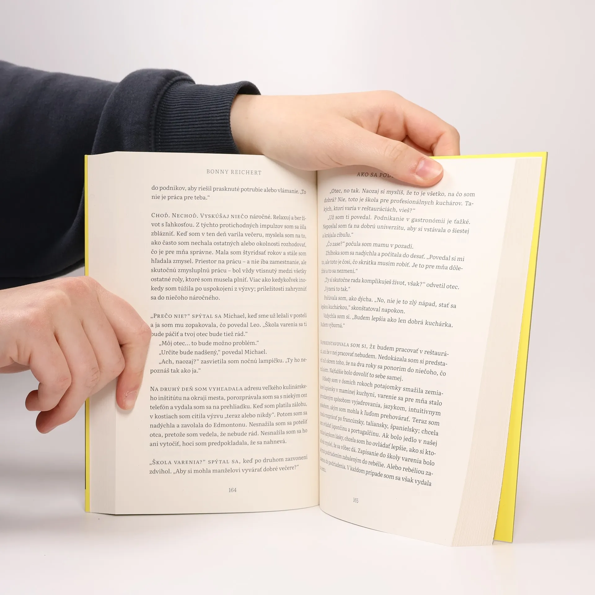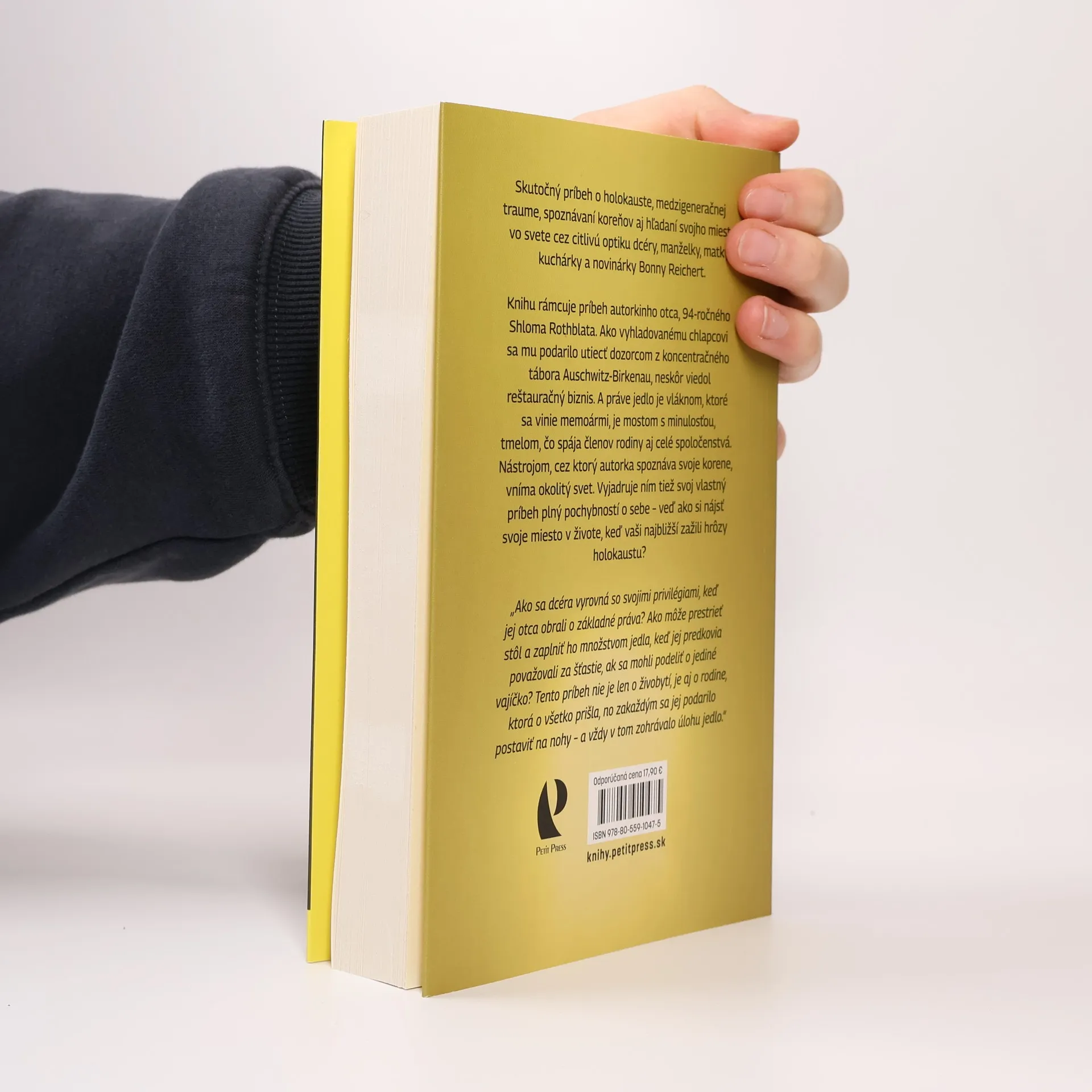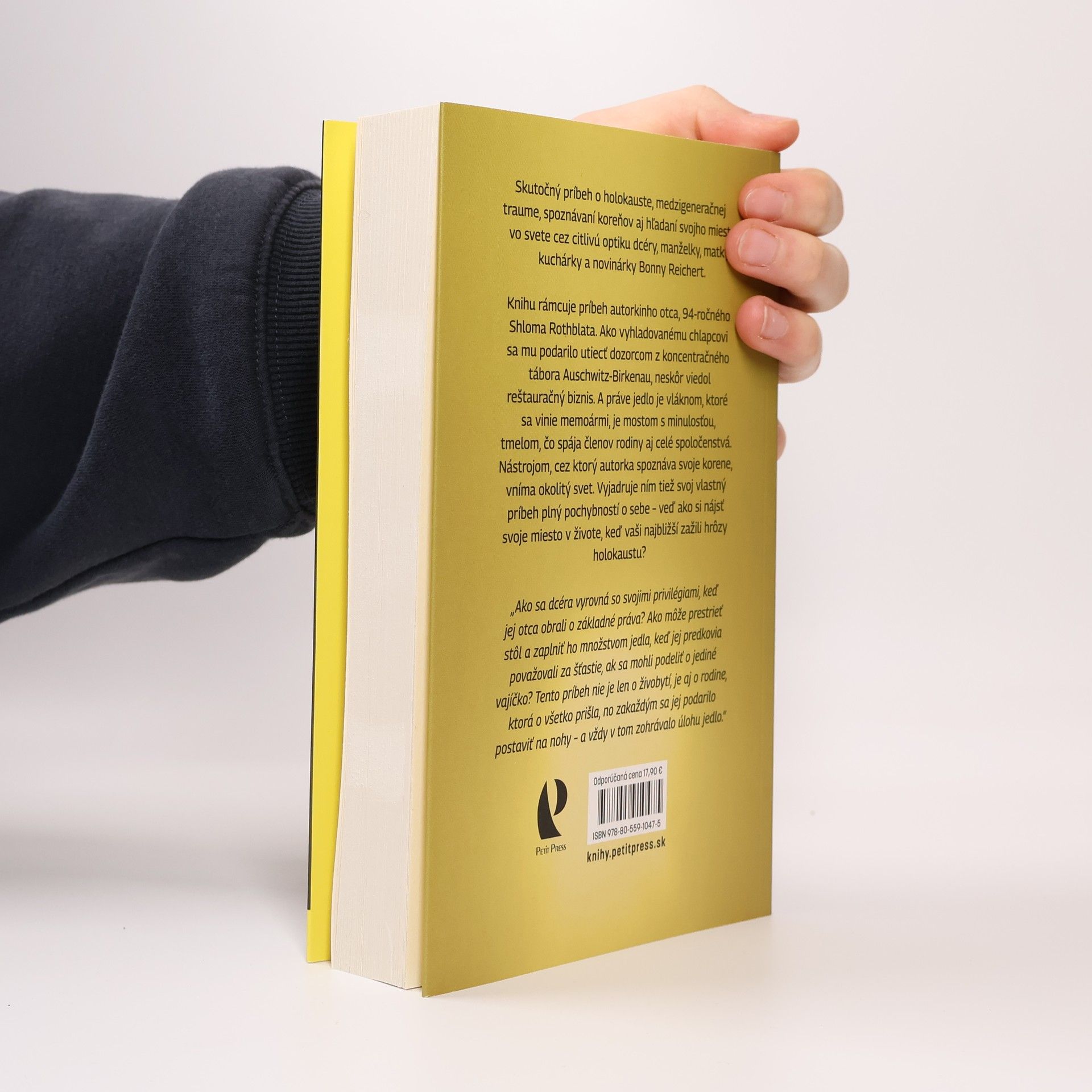 Skutočný príbeh o holokauste, medzigeneračnej traume, spoznávaní koreňov aj hľadaní si svojho miesta vo svete cez citlivú optiku dcéry, manželky, matky, kuchárky a novinárky Bonny Reichert. Knihu rámcuje príbeh autorkinho otca, 94-ročného Shloma Rothblata. Ako vyhladovanému chlapcovi sa mu podarilo utiecť dozorcom z koncentračného tábora Auschwitz-Birkenau, neskôr viedol reštauračný biznis. A práve jedlo je vláknom, ktoré sa vinie memoármi, je mostom s minulosťou, tmelom, čo spája členov rodiny aj celé spoločenstvá. Nástrojom, cez ktorý autorka spoznáva svoje korene, vníma okolitý svet. Vyjadruje ním tiež svoj vlastný príbeh plný pochybností o sebe – veď ako si nájsť svoje miesto v živote, keď vaši najbližší zažili hrôzy holokaustu? Bonny Reichert je kanadská novinárka. Za svoju knihu získala ocenenie Davea Grebera, každoročne udeľované kanadským autorom a autorkám, ktorí sú na voľnej nohe a venujú sa témam sociálnej spravodlivosti. Jej kniha citlivo poukazuje na tému medzigeneračnej traumy.