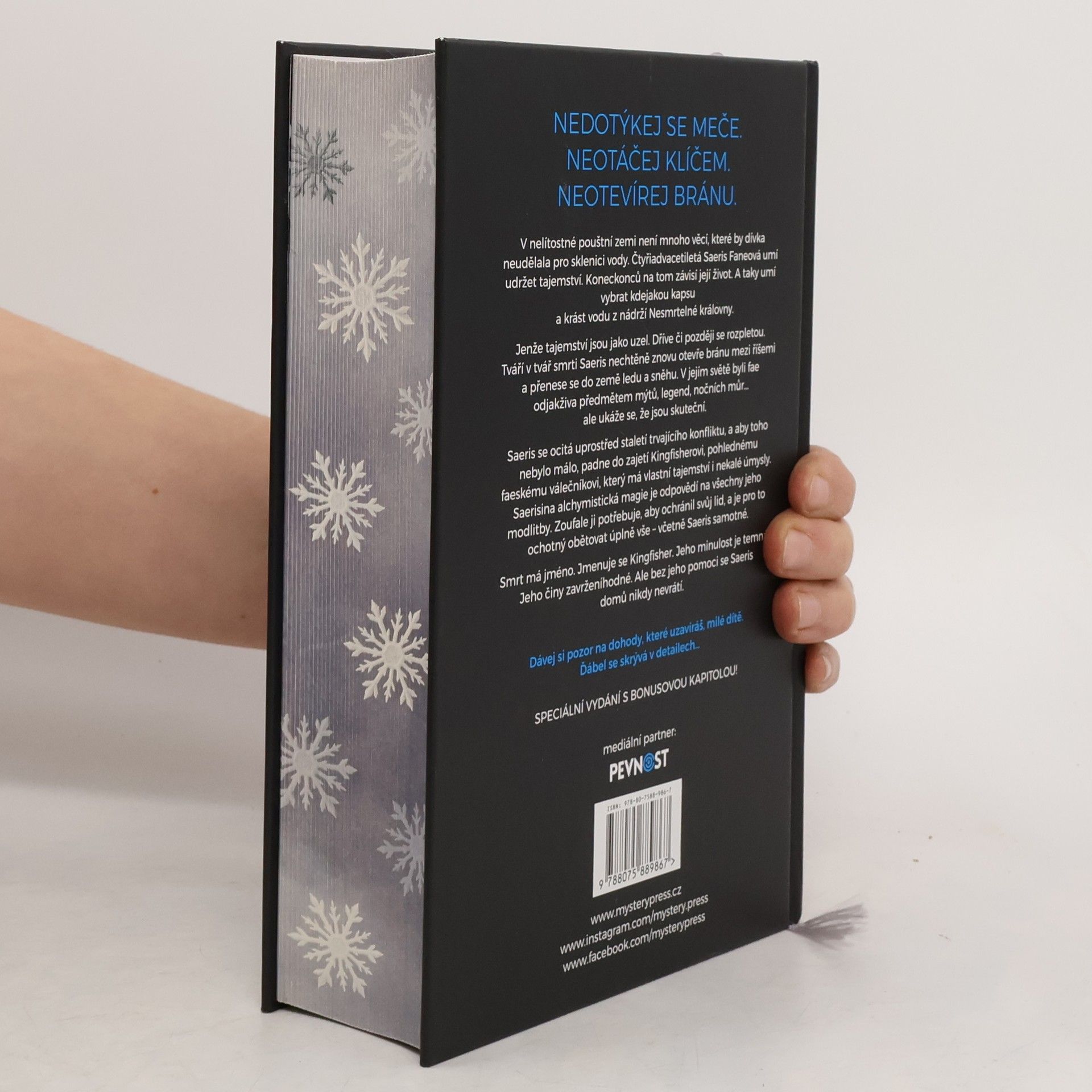 NEDOTÝKEJ SE MEČE. NEOTÁČEJ KLÍČEM. NEOTVÍREJ BRÁNU. SPECIÁLNÍ EDICE SE OD KLASICKÉ LIŠÍ OBÁLKOU, OŘÍZKOU A BONUSOVOU POVÍDKOU. V nelítostné pouštní zemi není mnoho věcí, které by dívka neudělala pro sklenici vody. Čtyřiadvacetiletá Saeris Faneová umí udržet tajemství. Koneckonců na tom závisí její život. A taky umí vybrat kdejakou kapsu a krást vodu z nádrží Nesmrtelné královny. Jenže tajemství jsou jako uzel. Dříve či později se rozpletou. Tváří v tvář smrti Saeris nechtěně znovu otevře bránu mezi říšemi a přenese se do země ledu a sněhu. V jejím světě byli fae odjakživa bytostmi z mýtů, legend, nočních můr... ale ukáže se, že jsou skuteční. Saeris se ocitá uprostřed staletí trvajícího konfliktu, a aby toho nebylo málo, padne do zajetí Kingfisherovi, pohlednému faeskému válečníkovi, který má vlastní tajemství i nekalé úmysly. Saerisina alchymistická magie je odpovědí na všechny jeho modlitby. Zoufale ji potřebuje, aby ochránil svůj lid, a je pro to ochotný obětovat úplně vše – včetně Saeris samotné. Smrt má jméno. Jmenuje se Kingfisher. Jeho minulost je temná. Jeho činy zavrženíhodné. Ale bez jeho pomoci se Saeris domů nikdy nevrátí. Dávej si pozor na dohody, které uzavíráš, milé dítě. Ďábel se skrývá v detailech…