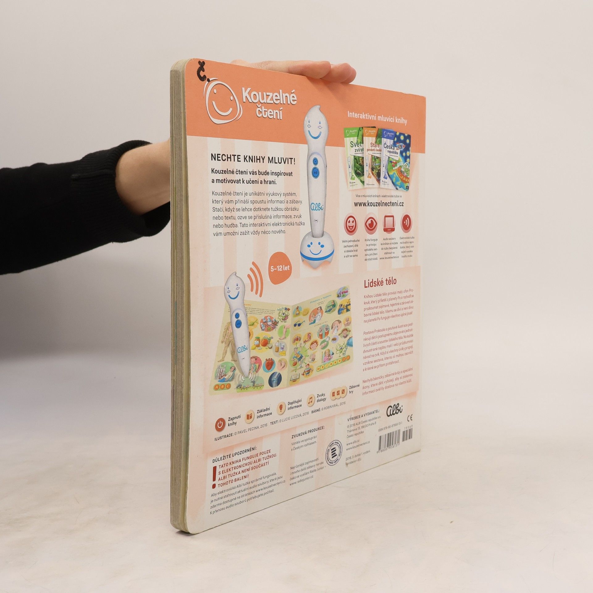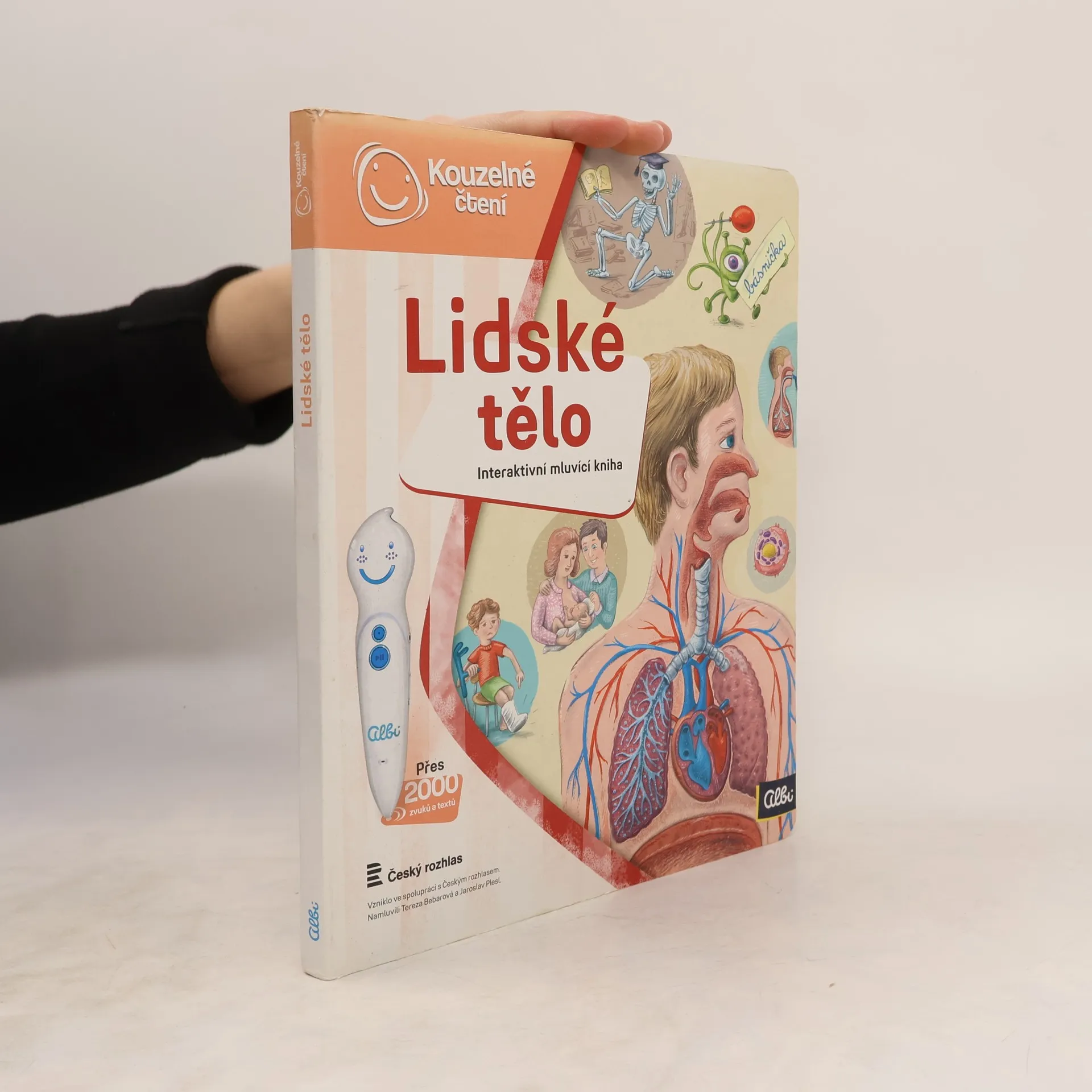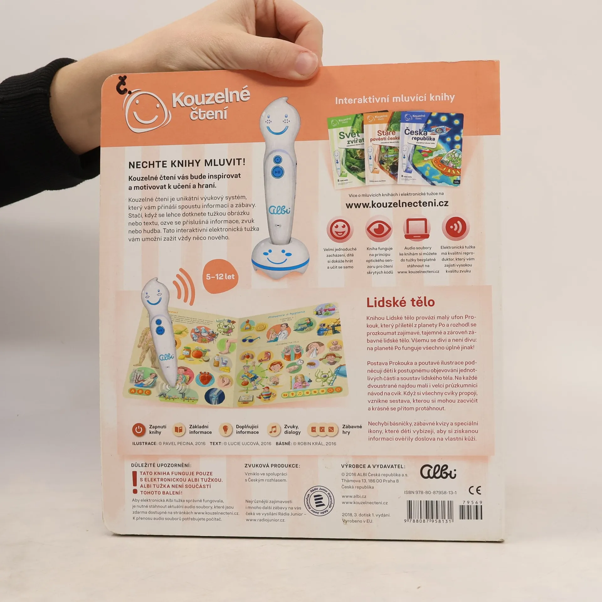 Interaktivní mluvící kniha z edice Kouzelné čtení, se kterou se děti již od 3 let dozvědí spoustu zajímavých a užitečných informací o našem těle. Knihou Lidské tělo provází malý ufon Prokouk, který přiletěl z planety Po, aby prozkoumal taje lidského těla. Všemu se diví a není divu: na planetě Po funguje všechno úplně jinak! Postava Prokouka a poutavé ilustrace podněcují děti k postupnému objevování jednotlivých částí a soustav lidského těla. Kniha je členěna do 8 kapitol a témata jsou např. Kosti a svaly, Mozek a nervy, Rozmnožování, Trávicí soustava, Srdce a plíce atd. Na každé dvoustraně najdou malí i velcí průzkumníci návod na cvik. Když si všechny cviky propojí, vznikne sestava, kterou si mohou zacvičit a krásně se přitom protáhnout. V knize Lidské tělo najdete také básničky, zábavné kvízy a speciální ikony, které děti vybízí, aby si získanou informaci zkusili doslava na vlastní kůži. Kniha obsahuje téměř 2000 zvuků a textů. Knihu ilustroval Pavel Pecina, básničky napsal Robin Král, texty Lucie Ujcová. Vzniklo ve spolupráci s Českým rozhlasem, knihu namluvili Tereza Bebarová a Jaroslav Plesl.
