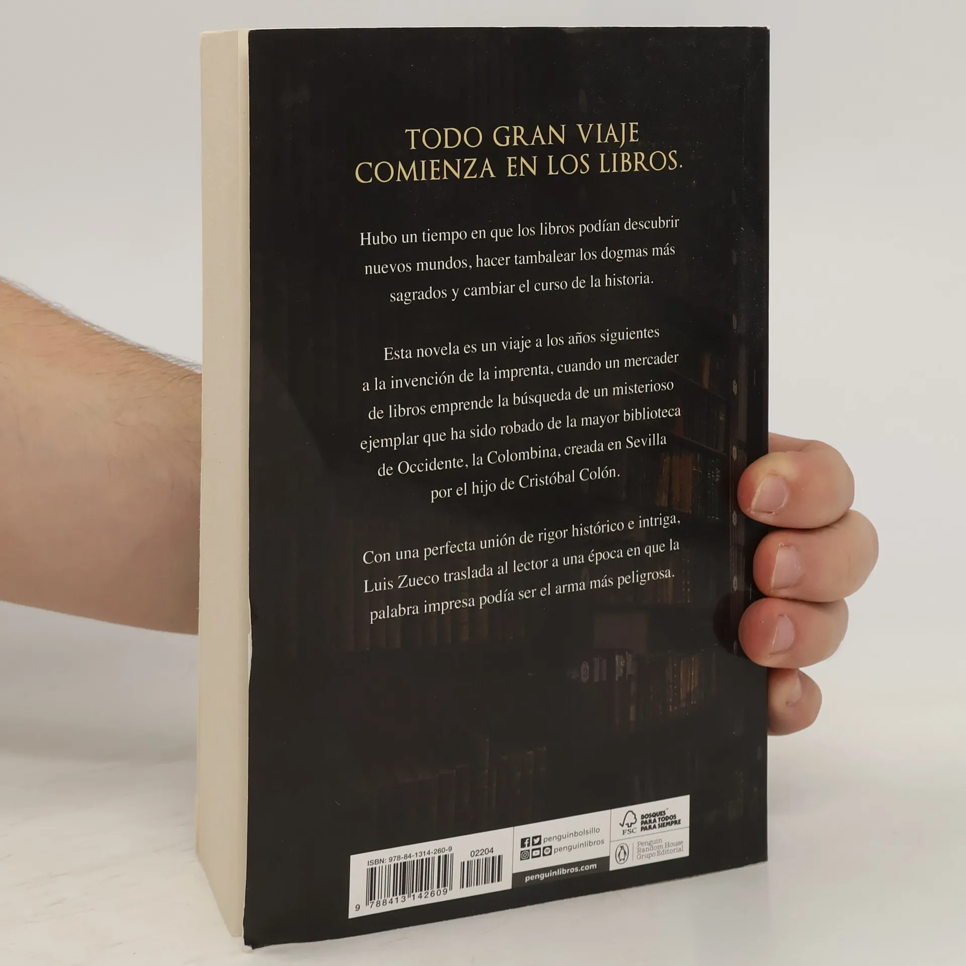 Hubo un tiempo en que los libros podían descubrir nuevos mundos, tambalear los dogmas más sagrados y cambiar el curso de la Historia.Esta novela es un viaje a los años siguientes a la invención de la imprenta, cuando un mercader de libros emprende la búsqueda de un misterioso ejemplar que ha sido robado de la mayor biblioteca de Occidente, creada en Sevilla por el hijo de Cristóbal Colón.Año 1517. El joven Thomas atraviesa la incipiente Europa renacentista huyendo de su pasado. Son los años siguientes al descubrimiento de América y la invención de la imprenta, un periodo de profundos cambios que han supuesto el fin de la Edad Media. La curiosidad que siente por el Nuevo Mundo, cosechada en sus múltiples lecturas, le llevará hasta España, donde comenzará a trabajar con un mercader de libros.El encargo de localizar un ejemplar envuelto en un halo misterioso le conduce hasta Sevilla, una próspera ciudad que sirve como enlace en el comercio con las Indias y que alberga, entre sus murallas, la biblioteca más importante de Occidente, creada por el hijo de Cristóbal Colón y llamada la Colombina. Será precisamente allí donde Thomas descubra que alguien ha robado el libro que él busca y, por alguna razón, tiene mucho interés en que nadie lo encuentre.Hubo un tiempo en que los libros permitían descubrir nuevos mundos, tambalear los dogmas más sagrados y cambiar el curso de la Historia. Luis Zueco nos sumerge en los albores de la bibliofilia y nos traslada, en una perfecta unión de rigor histórico y trama trepidante, a una época en la que la palabra impresa podía ser el arma más peligrosa.