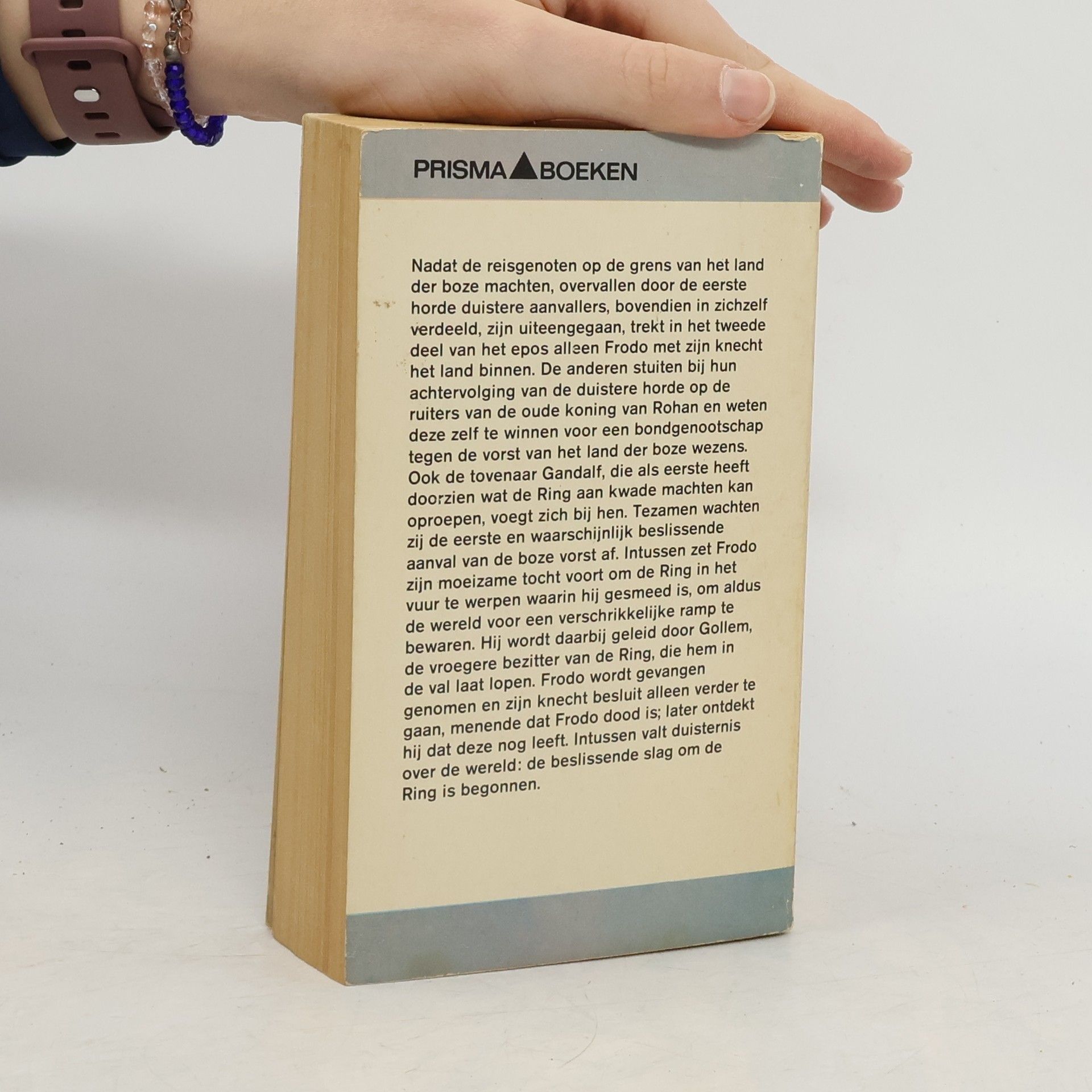 Tekst van de achterflap: Nadat de reisgenoten op de grens van het land der boze machten, overvallen door de eerste horde duistere aanvallers, bovendien in zichzelf verdeeld, zijn uiteengegaan, trekt in het tweede deel van het epos alleen Frodo met zijn knecht het land binnen. De anderen stuiten bij hun achtervolging van de duistere horde op de ruiters van de oude koning van Rohan en weten deze zelf te winnen voor een bondgenootschap tegen de vorst van het land der boze wezens. Ook de tovenaar Gandalf, die als eerste heeft doorzien wat de Ring aan kwade machten kan oproepen, voegt zich bij hen. Tezamen wachten zij de eerste en waarschijnlijk beslissende aanval van de boze vorst af. Intussen zet Frodo zijn moeizame tocht voort om de Ring in het vuur te werpen waarin hij gesmeed is, om aldus de wereld voor een verschrikkelijke ramp te bewaren. Hij wordt daarbij geleid door Gollem, de vroegere bezitter van de Ring, die hem in de val laat lopen. Frodo wordt gevangen genomen en zijn knecht besluit alleen verder te gaan, menende dat Frodo dood is; later ontdekt hij dat deze nog leeft. Intussen valt de duisternis over de wereld: de beslissende slag om de Ring is begonnen.