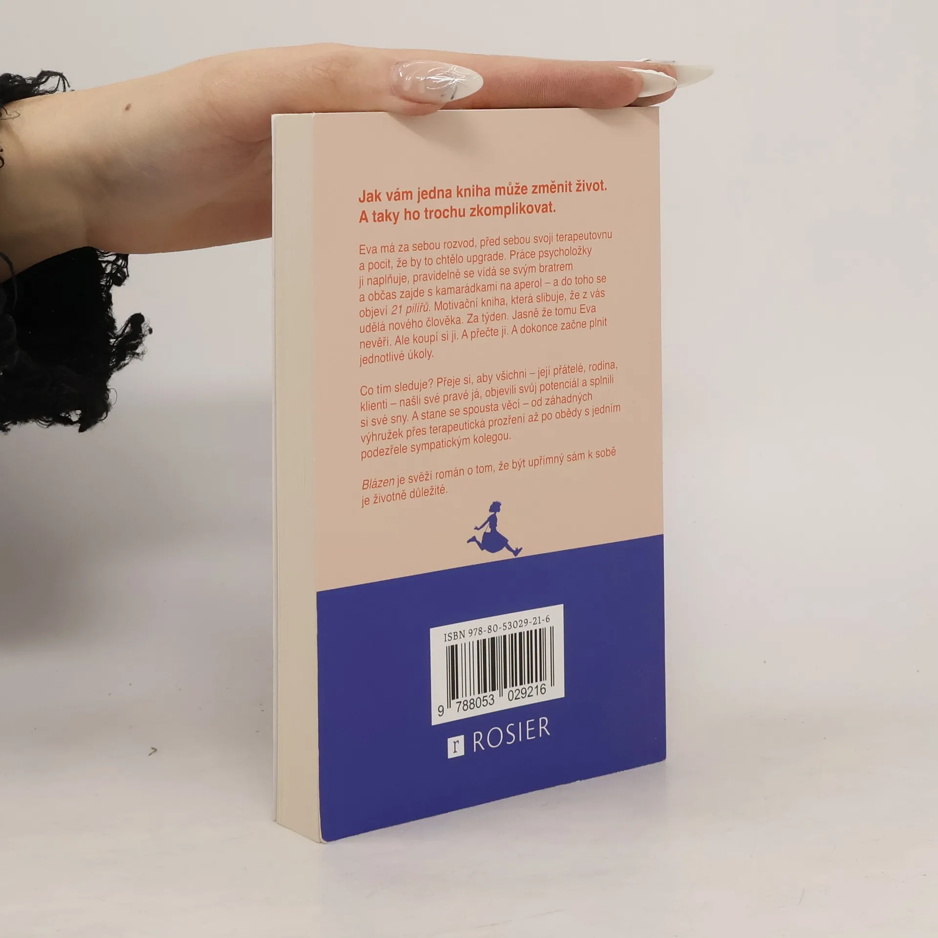 Jak vám jedna kniha může změnit život. A taky ho trochu zkomplikovat. Eva má za sebou rozvod, před sebou svoji terapeutovnu a pocit, že by to chtělo upgrade. Práce psycholožky ji naplňuje, pravidelně se vídá se svým bratrem a občas zajde s kamarádkami na aperol – a do toho se objeví 21 pilířů. Motivační kniha, která slibuje, že z vás udělá nového člověka. Za týden. Jasně že tomu Eva nevěří. Ale koupí si ji. A přečte ji. A dokonce jednotlivé úkoly začne plnit. Co tím sleduje? Sama pořádně neví. Ale rozhodně se při tom stane spousta věcí – od záhadných výhružek přes terapeutická prozření až po jednoho podezřele sympatického kolegu. Blázen je svěží román o tom, že upřímný sám k sobě je životně důležité.