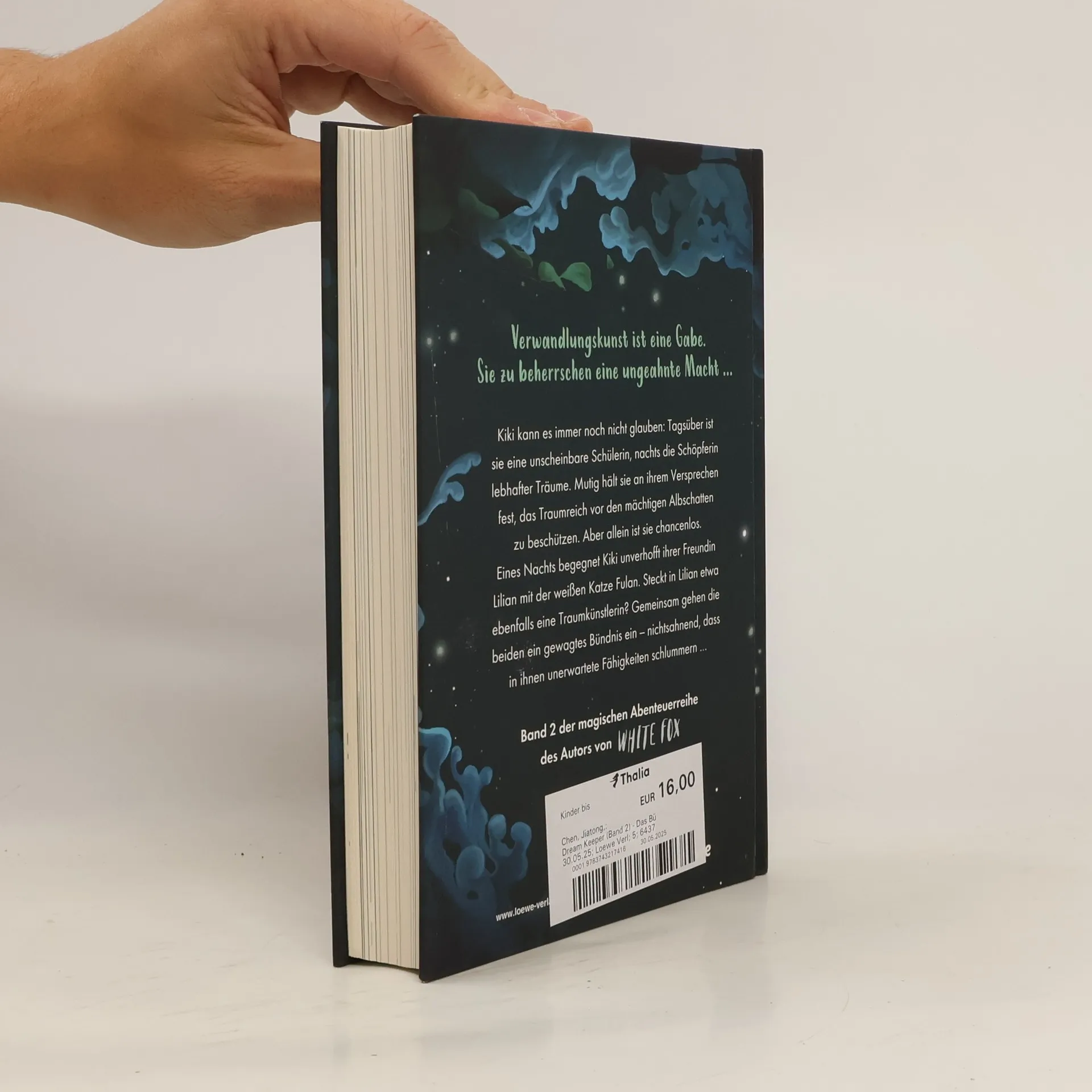 Verwandlungskunst ist eine Gabe. Sie zu beherrschen eine ungeahnte Macht … Kiki kann es immer noch nicht glauben: Tagsüber ist sie eine unscheinbare Schülerin, nachts die Schöpferin lebhafter Träume. Mutig hält sie an ihrem Versprechen fest, das Traumreich vor den mächtigen Albschatten zu beschützen. Aber allein ist sie chancenlos. Da begegnet Kiki unverhofft ihrer Freundin Lilian mit der weißen Katze Fulan. Steckt in Lilian etwa ebenfalls eine Traumkünstlerin? Gemeinsam gehen die beiden ein gewagtes Bündnis ein – nichtsahnend, dass in ihnen unerwartete Fähigkeiten schlummern … Band 2 der magischen Abenteuerreihe des Autors von White Fox Ein fesselndes und geheimnisvolles Fantasy-Abenteuer für Kinder ab 9 Jahren aus der Feder des chinesischen Bestseller-Autors Chen Jiatong . Coolness , Natur , Action , Tiere und die Macht der Träume sorgen für spannenden Lesespaß . Lerne Lilian und ihre weiße Katze kennen und begleite Kiki und ihren schwarzen Kater in das Reich der Träume . Eine moderne Parabel rund um Traum und Wirklichkeit , Wünsche und Gefahren . Für alle Fans von White Fox ! Mit beeindruckenden Schwarz-Weiß-Illustrationen von Marie Beschorner. Der Titel ist bei Antolin gelistet.