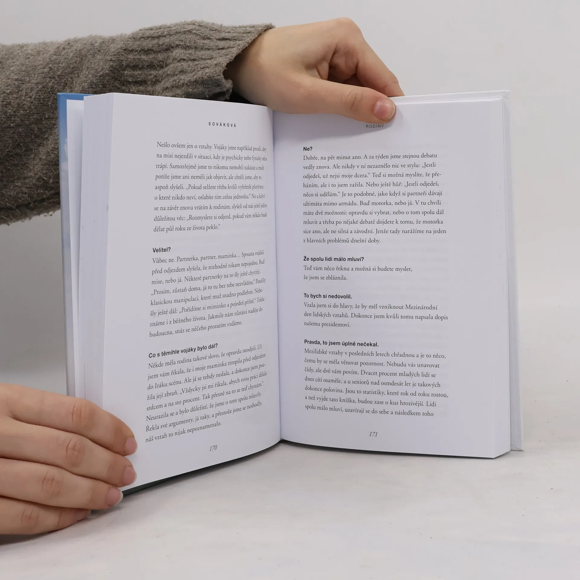 Na můj povel, knihu do ruky! Hlášení podává Helena Sováková, výjimečná žena, která v české armádě strávila víc než dvacet let a dotáhla to až na hodnost plukovnice. Sloužila v Iráku i v Afghánistánu a zažila téměř vše: smrt, strach, šikanu v mužském prostředí, ale i spoustu vojenského humoru. Třeba když na základnu v Iráku přivezli bezradným vojákům nové pračky…Jako hlavní armádní psycholožka pomohla desítkám kolegů, kteří po návratu z války trpěli nočními můrami. Starala se o rodiny, které v boji ztratily syna či partnera. Zároveň zůstává oporou stovkám lidí, kteří čelí nejrůznějším životním překážkám — v práci, ve vztazích i při výchově dětí. Je to kniha nejen o životě v uniformě, ale taky o naději. O tom, že i když nám v životě není dobře, existuje cesta ven.Varování: Během četby hrozí dojetí, husí kůže, smích i úbytek stresu. A to díky mnoha praktickým radám, které kniha obsahuje.Otázky kladl Martin Moravec, jehož předchozí knižní rozhovory s neurochirurgem Vladimírem Benešem, pilotem Davidem Heclem, vyšetřovatelem Josefem Marešem, lékařem letecké záchranky Markem Dvořákem a vyjednavačem Adamem Dolníkem se staly bestsellery.