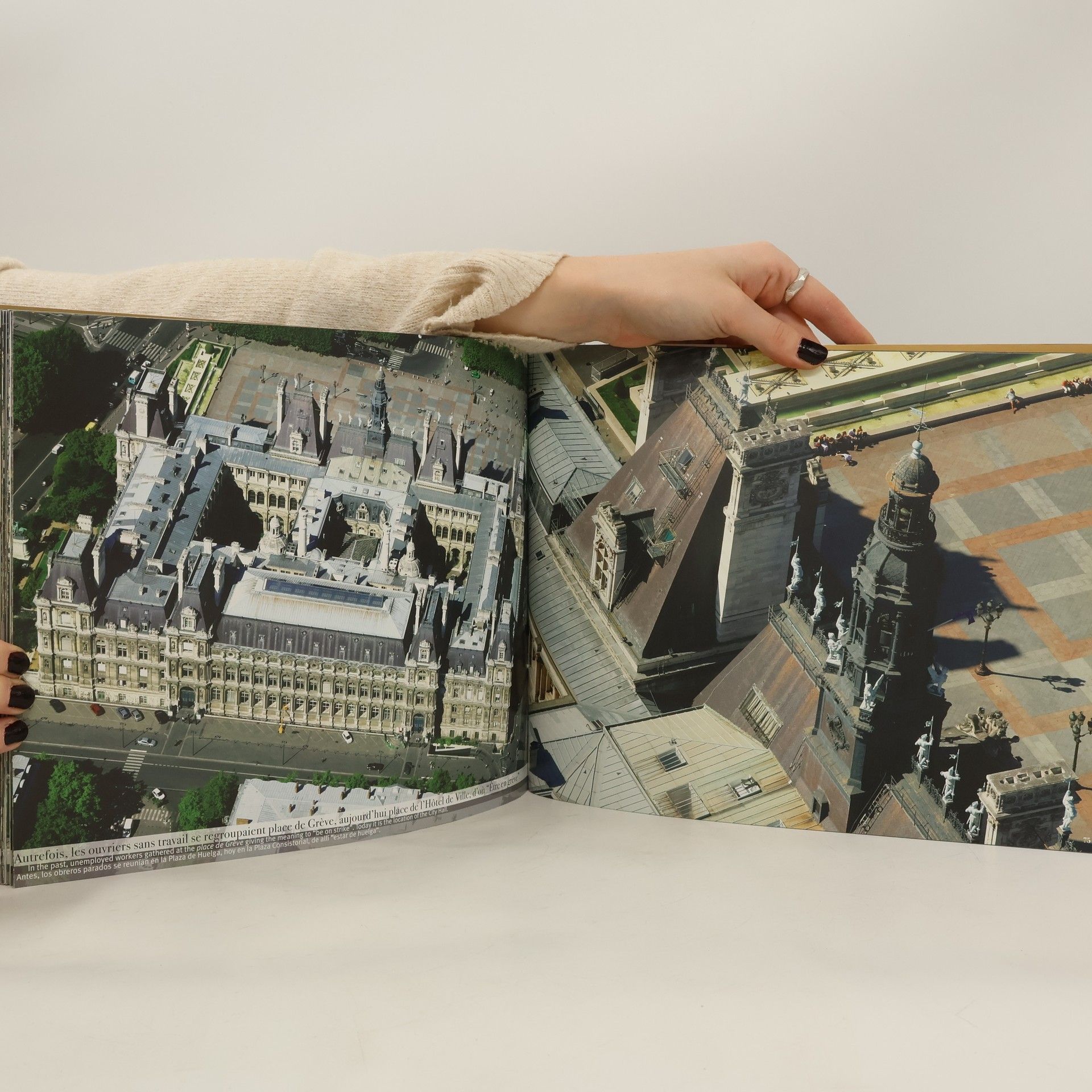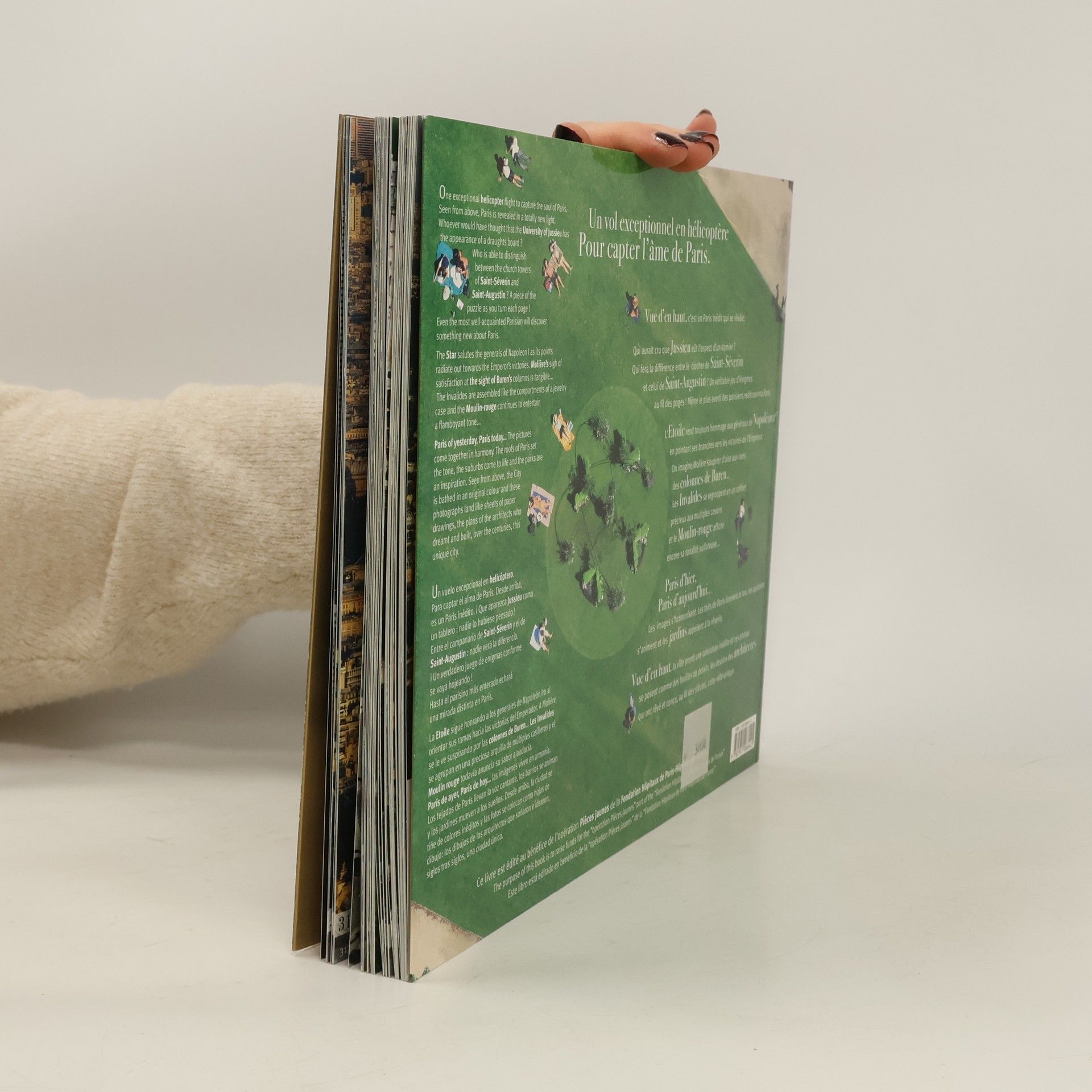 Vue d'en haut, c'est un Paris inédit qui se révèle. Qui aurait cru que Jussieu eût l'aspect d'un damier ? Qui fera la différence entre le clocher de Saint-Séverin et celui de Saint-Augustin ? Un véritable jeu d'énigmes au fil des pages ! Même le plus averti des parisiens redécouvrira Paris. L'Etoile rend toujours hommage aux généraux de Napoléon Ie en pointant ses branches vers les victoires de l'Empereur. On imagine Molière soupirer d'aise aux vues des colonnes de Buren... Les Invalides se regroupent en un coffret précieux aux multiples casiers et le Moulin-Rouge affiche encore sa tonalité sulfureuse... Paris d'hier, Paris d'aujourd'hui... Les images s'harmonisent. Les toits de paris donnent le ton, les quartiers s'animent et les jardins appellent à la rêverie. Vue d'en haut, la ville prend une coloration inédite et ces photos se posent comme des feuilles de dessin, les dessins des architectes qui ont rêvé et conçu, au fil des siècles, cette ville unique.