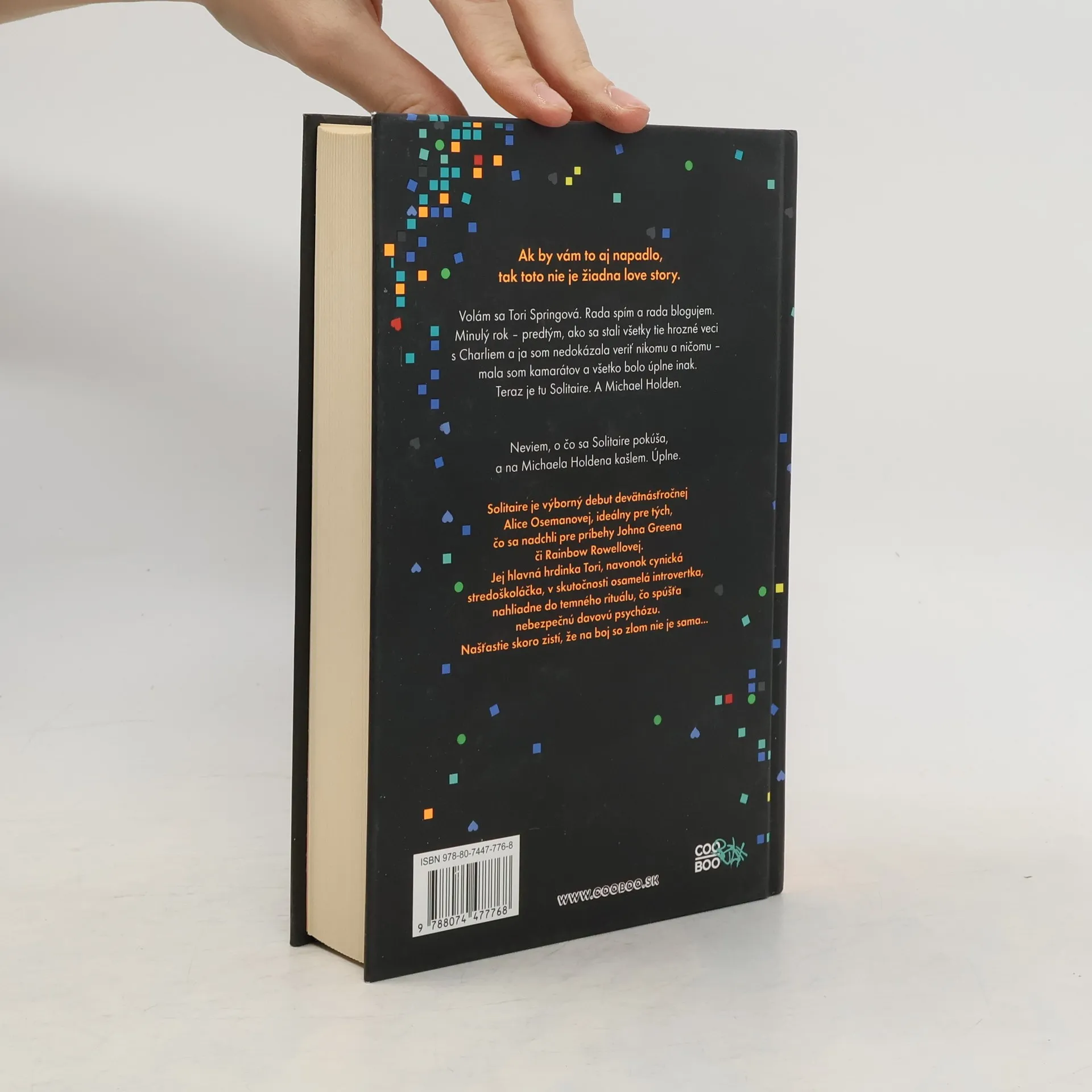 Pokiaľ by vám to napadlo, toto nie je žiadna love story. Volám sa Tori Springová. Rada spím a rada blogujem. Minulý rok – pred tým všetkým, čo sa stalo s Charliem a predtým, než som sa musela vysporiadať s maturitou a prihláškou na vysokú a faktom, že jedného dňa naozaj budem musieť začať s ľuďmi hovoriť – som mala priateľov. Všetko bolo úplne inak, ale to teraz skončilo. Teraz je tu Solitaire. A Michael Holden. Viem, o čo sa Solitaire pokúša, a Michael Holden je mi ukradnutý. Naozaj. Solitaire je skvelý debut mladej Alice Osemanovej, ktorej hlavná hrdinka Tori je cynická až do špiku kostí a autentická stredoškoláčka rovnako ako jej autorka.