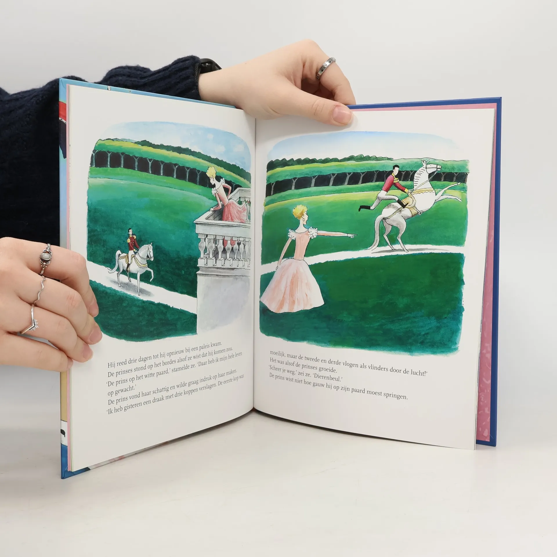 De prins had een fijn leventje. Maar hij moest van zijn vader trouwen. Vol vertrouwen ging hij op zijn witte paard op weg om een prinses te vinden. Prentenboek met gekleurde pentekeningen. Vanaf ca. 4 jaar.