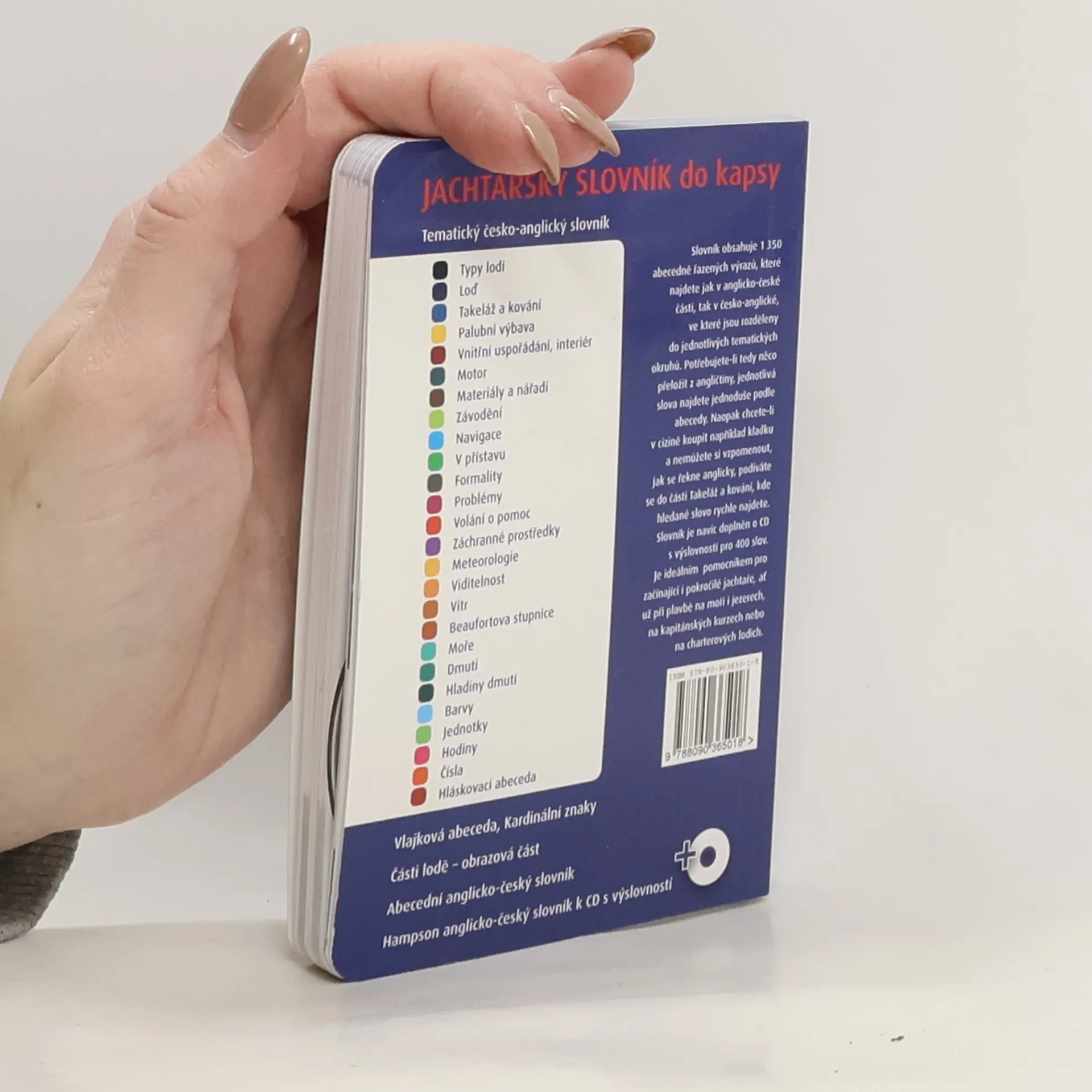 Slovník obsahuje 1 350 abecedně řazených výrazů, které najdete jak v anglicko-české části, tak v česko-anglické, ve které jsou rozděleny do jednotlivých tematických okruhů. Hodí se pro začínající i pokročilé jachtaře při plavbě na charterových lodích nebo při kapitánských kurzech.