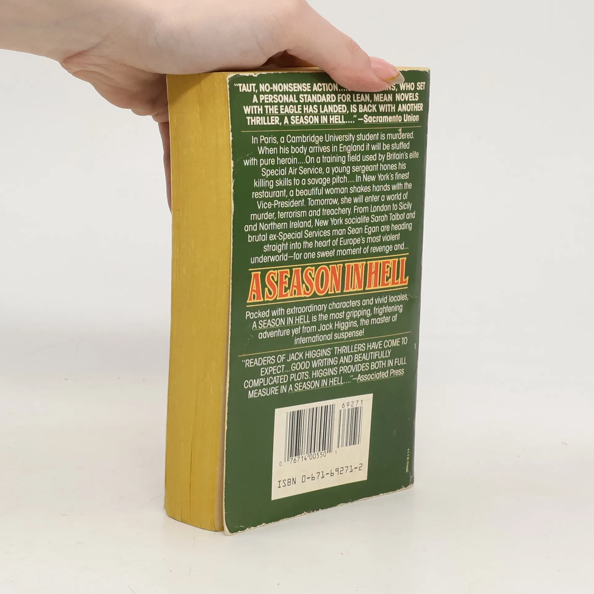 In Paris, a Cambridge University student is murdered. When his body arrives in England it will be stuffed with pure heroin ... On a training field used by Britain's elite Special Air Service, a young sergeant hones his killing skills to a savage pitch ... In New York's finest restaurant, a beautiful woman shakes hands with the Vice-President. Tomorrow, she will enter a world of murder, terrorism and treachery. From London to Sicily and Northern Ireland, New York socialite Sarah Talbot and brutal ex-Special Services man Sean Egan are heading straight into the heart of Europe's most violent underworld --- for one sweet moment of revenge and ... A SEASON IN HELL