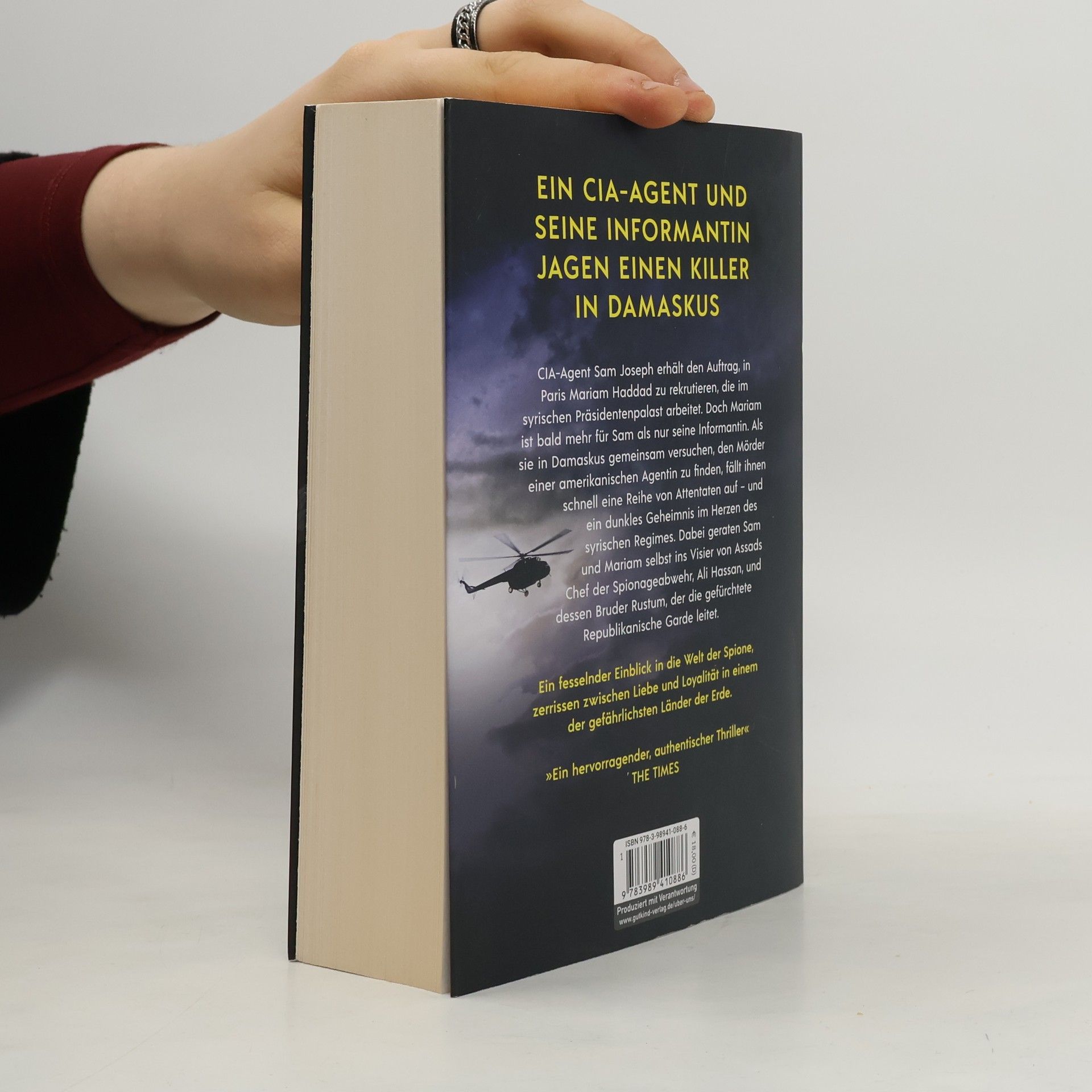 Ein CIA-Agent und seine Informantin jagen einen Killer in Damaskus - "Ein hervorragender, authentischer Thriller" The Times CIA-Agent Sam Joseph erhält den Auftrag, in Paris Mariam Haddad zu rekrutieren, die im syrischen Präsidentenpalast arbeitet. Zwischen ihnen entwickelt sich eine verbotene Beziehung. Sie bringt beide in große Gefahr, als sie in Damaskus versuchen, den Mörder einer amerikanischen Agentin zu finden. Das Katz-und-Maus-Spiel führt sie schnell auf die Spur einer Reihe von Attentaten – und zu einem dunklen Geheimnis im Herzen des syrischen Regimes. Dabei geraten sie selbst ins Visier von Assads Chef der Spionageabwehr, Ali Hassan, und dessen Bruder Rustum, der die gefürchtete Republikanische Garde leitet. Vor dem Hintergrund eines von Angst und Aufruhr geprägten Syrien, liefert dieser fesselnde Thriller einen authentischen und vielschichtigen Einblick in die Welt der Spione, zerrissen zwischen Liebe und Loyalität in einem der gefährlichsten Länder der Erde. "Einfach herausragendes Storytelling. Essentielle Lektüre für alle Fans des Genres." Financial Times Bei Fragen zur Produktsicherheit, wenden Sie sich bitte an: info@gutkind-verlag.de