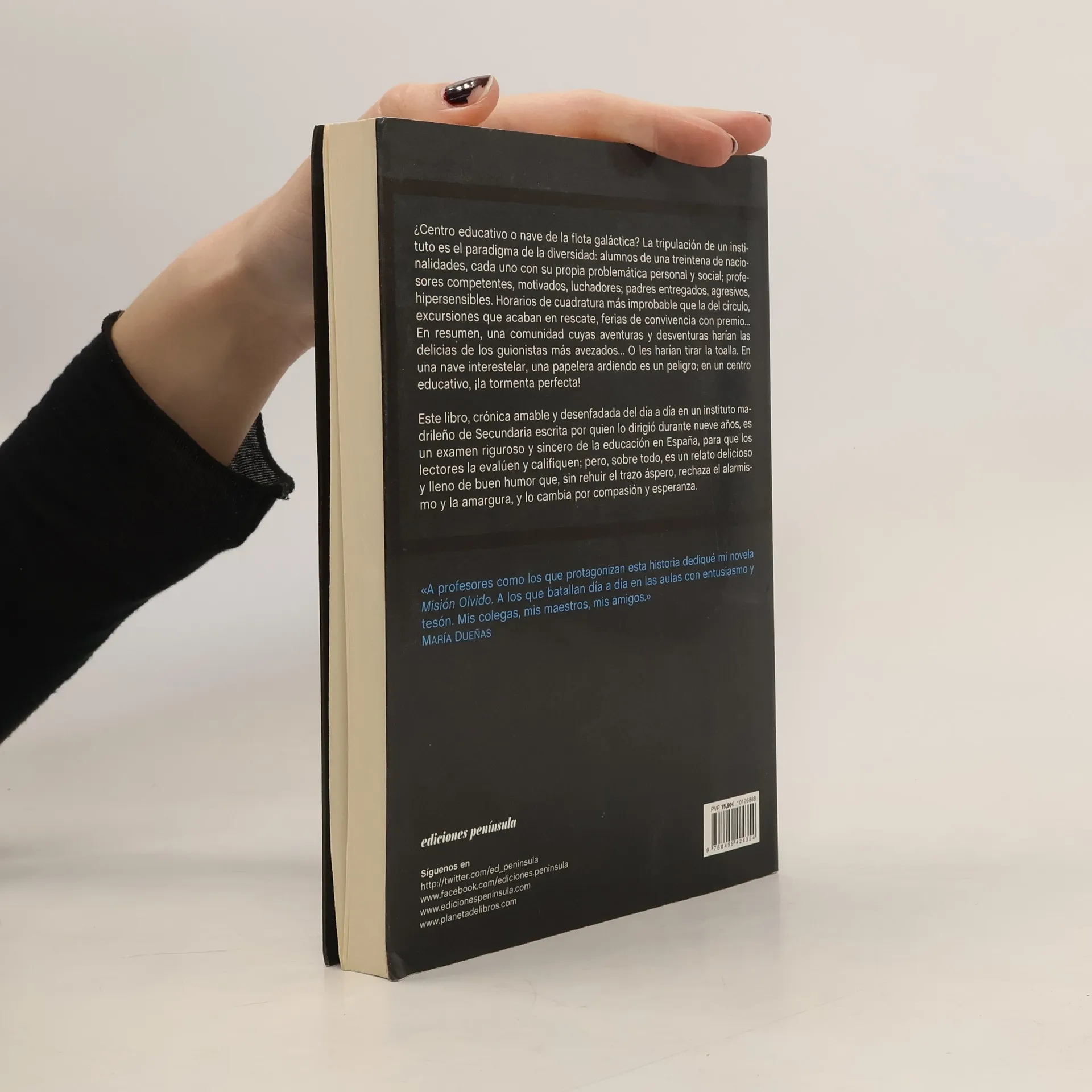 ¿Centro educativo o nave de la flota galáctica? La tripulación de un instituto es el paradigma de la diversidad: alumnos de una treintena de nacionalidades, cada uno con su propia problemática personal y social; profesores competentes, motivados, luchadores; padres entregados, agresivos, hipersensibles. Horarios de cuadratura más improbable que la del círculo, excursiones que acaban en rescate, ferias de convivencia con premio… En resumen, una comunidad cuyas aventuras y desventuras harían las delicias de los guionistas más avezados… O les harían tirar la toalla. En una nave interestelar, una papelera ardiendo es un peligro; en un centro educativo, ¡la tormenta perfecta! Este libro, crónica amable y desenfadada del día a día en un instituto madrileño de Secundaria escrita por quien lo dirigió durante nueve años, es un examen riguroso y sincero de la educación en España, para que los lectores la evalúen y califiquen; pero, sobre todo, es un relato delicioso y lleno de buen humor que, sin rehuir el trazo áspero, rechaza el alarmismo y la amargura, y lo cambia por compasión y esperanza.