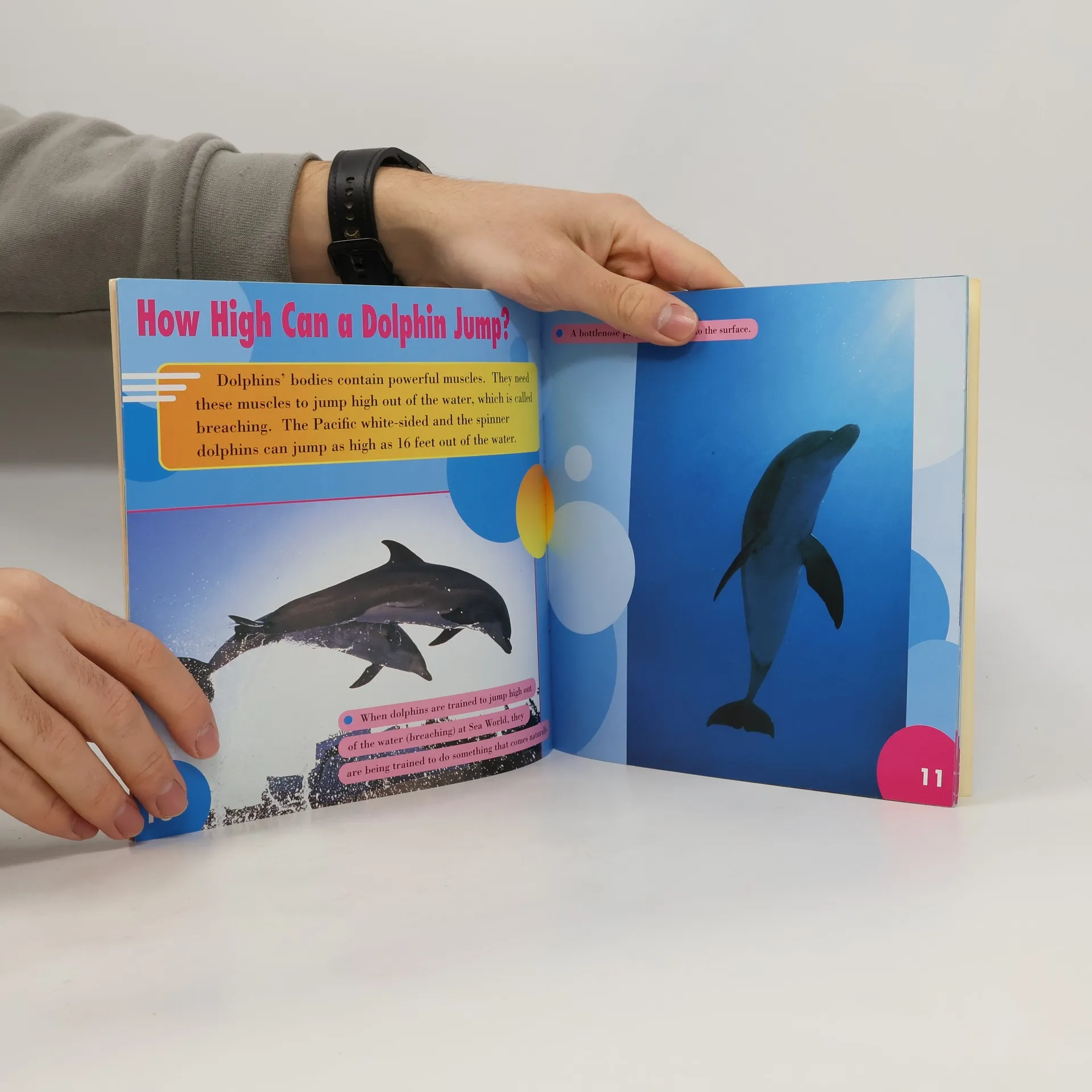 Presents information about dolphins, including how they move and eat, dolphin babies, types of dolphins, their role at Sea World, and the dangers they face