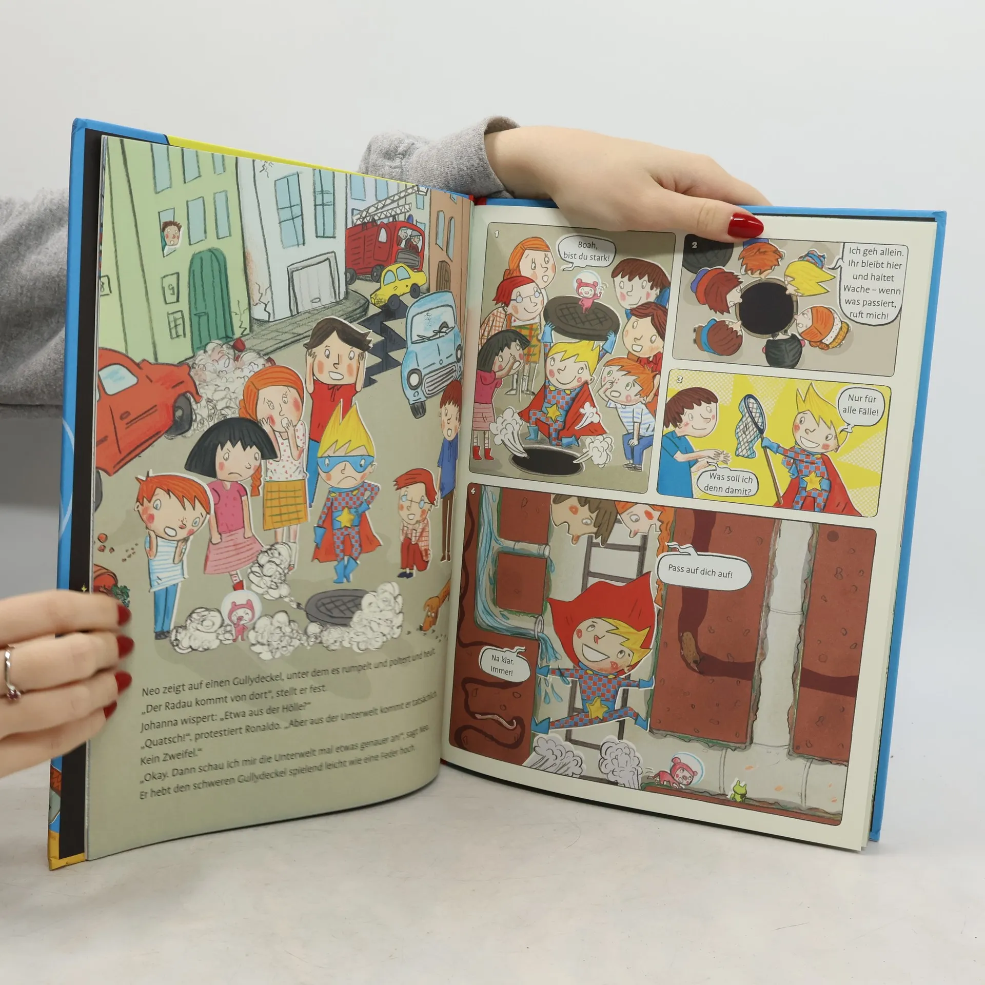 Die Erde bebt, die Häuser wackeln und ein dumpfes Grollen liegt in der Luft. Ronaldo und die anderen Kinder können schon gar nicht mehr schlafen vor Angst – etwas Schreckliches muss geschehen sein … Super Neo geht der Sache auf den Grund. In der Unterwelt trifft er auf einen gewissen Grünfinger und auf ein riesiges, fauchendes Monster. Super Neo ist jedoch nicht nur superstark und superschnell, sondern auch superschlau und findet bald heraus, dass das Monster in Wahrheit die kleine Ratte Zorro ist. Grünfinger hat sie mit seiner Mini-Max-Maschine gescannt. Was führt der Bösewicht im Schilde? Eine Verfolgungsjagd durch das Kanallabyrinth beginnt. Super Neo ist Grünfinger mit Lichtgeschwindigkeit auf den Fersen – aber der Schurke hat ein Turbomobil, dagegen ist selbst Super Neo lahm … Jetzt ist Köpfchen gefragt! Ein neues Abenteuer von Super Neo mit viel Action und Sternenpower. Ideal zum Vorlesen auch für Erdlinge.