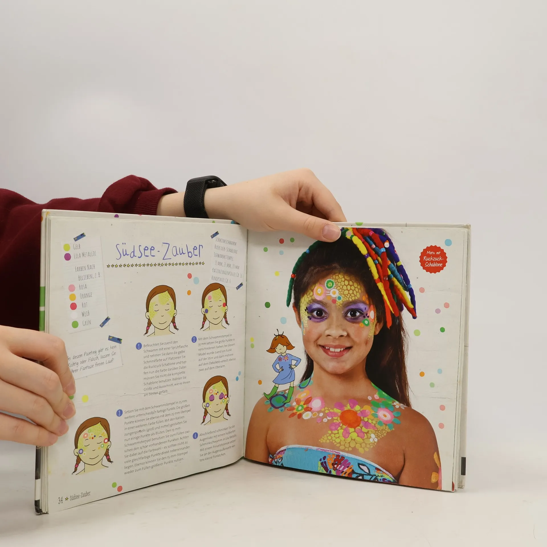 Kinderschminken ist auf jedem Fest der Renner. Kein Problem mit der beiliegenden Ruckzuck-Schablone! Mit ihr können fantasievolle Motive im Handumdrehen geschminkt werden, die jedes Kinderherz höher schlagen lassen. Der ausführliche Grundlagenteil über Materialien und Anwendung sorgt dafür, dass Kinder schnell zu einer perfekt geschminkten Fratze kommen – und auch Erwachsene werden an den Motiven ihre Freude haben!
