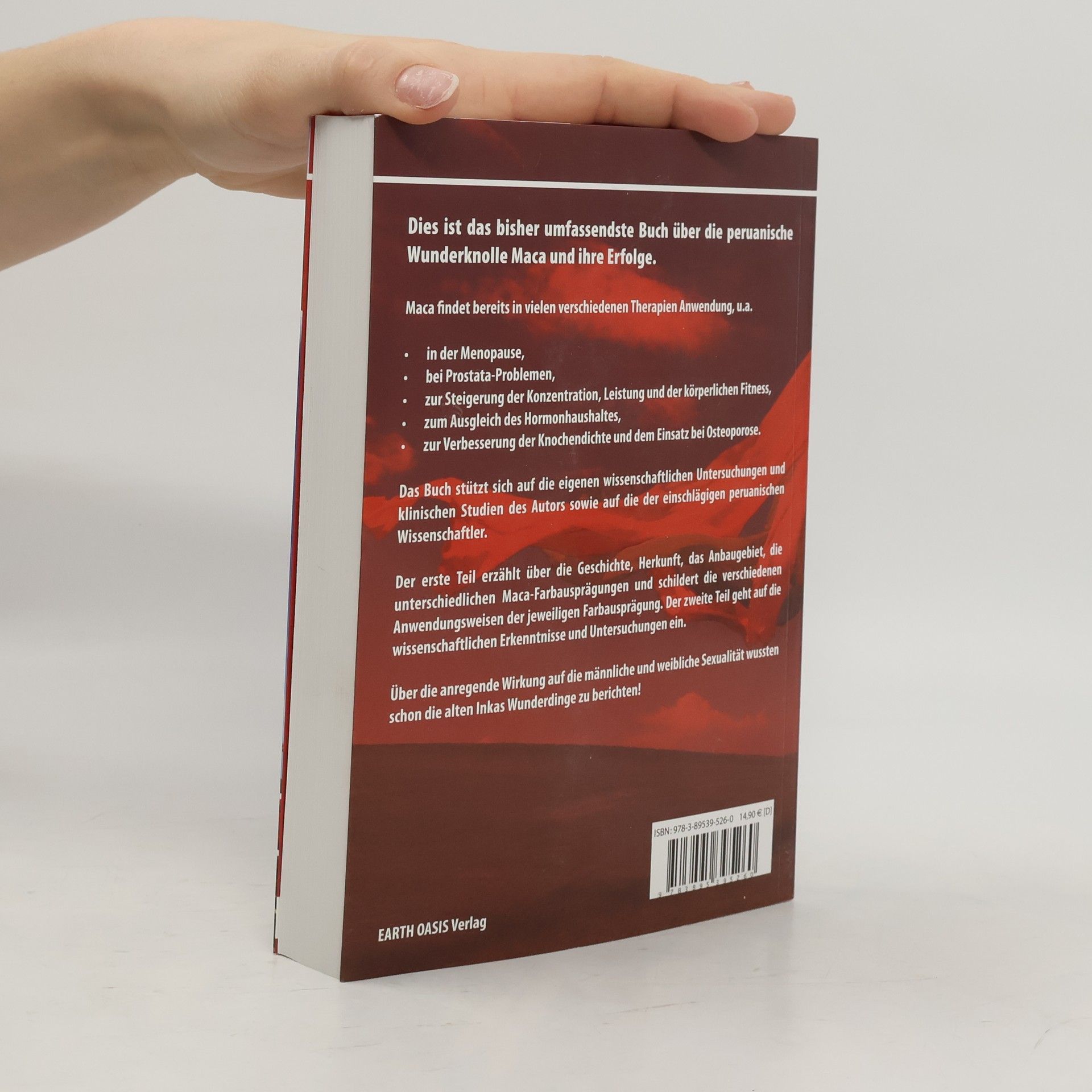 Dies ist das erste populärwissenschaftliche Buch über die peruanische Wunderknolle Maca, verfasst von einem Wissenschaftler, der sein Lebenswerk dieser einzigartigen Konlle widmet. Das Buch stütz sich auf seine eigenen wissenschaftlichen Untersuchungen und klinischen Studien sowie auf die der einschlägigen peruanischen Wissenschaftler. Der erste, populärwissenschaftliche Teil, erklärt in verständlicher Weise die Wirkungsweise von Maca, erzählt über Geschichte, Herkunft, das Anbaugebiet, die unterschiedlichen Maca-Farben und schildert die Anwendungsgebiete der jeweiligen Farbausprägung. Der zweite Teil geht auf wissenschaftliche Erkenntnisse und Untersuchungen ein. Das Buch informiert über die Erfolge der Maca-Therapie in der Menopause, zur Verbesserung der Knochendichte und dem Einsatz bei Osteoporose, bei Prostata-Problemen, zur Steigerung der Konzentration, Leistung und körperliche Fitness, zum Ausgleich des Hormonhaushaltes und über viele weiter Anwendungsgebiete. Über die anregende Wirkung auf die männliche und weibliche Sexualität wussten schon die alten Inkas Wunderdinge zu berichten.
