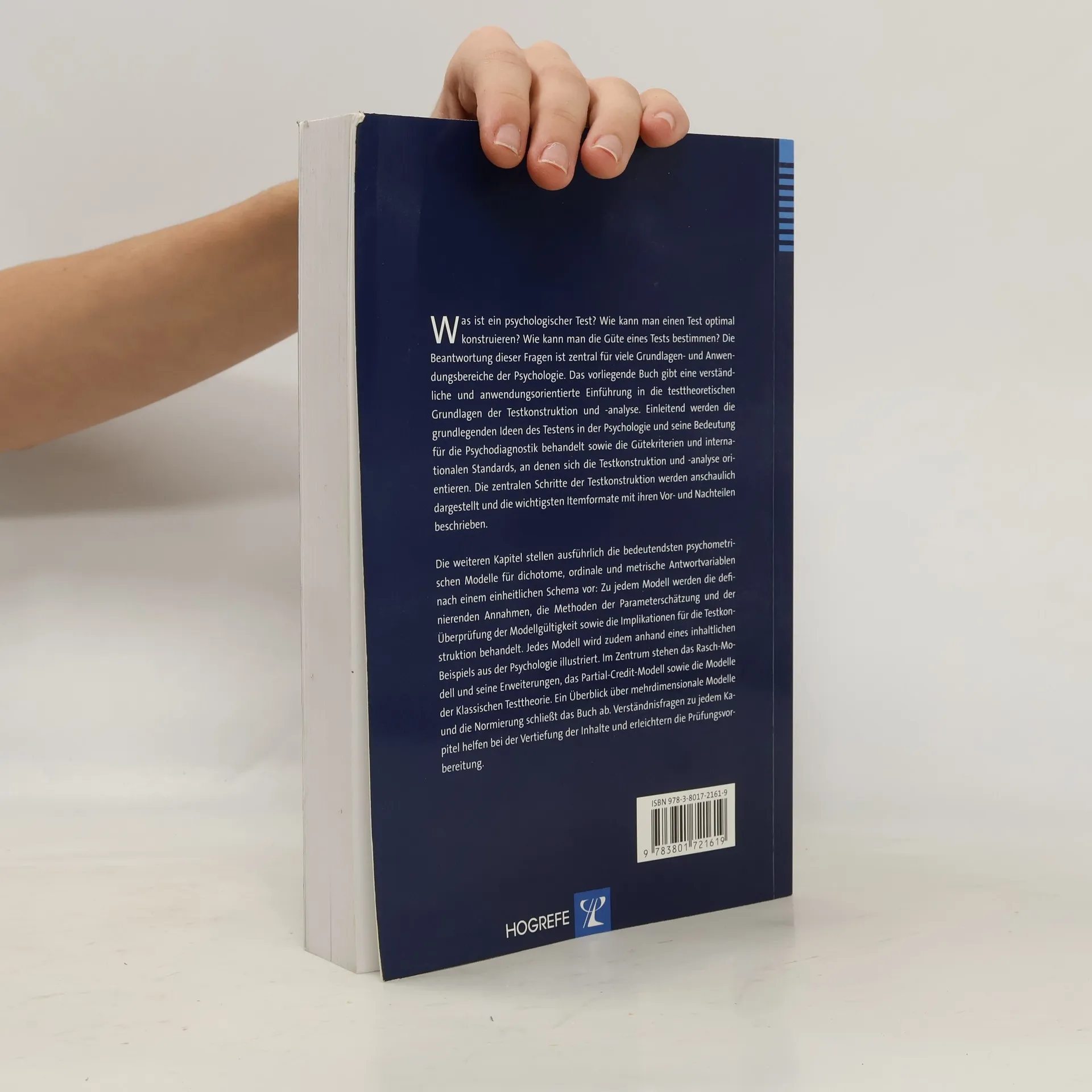 Was ist ein psychologischer Test? Wie wird er optimal konstruiert und bewertet? Diese Fragen sind zentral für viele Bereiche der Psychologie. Das Buch bietet eine verständliche Einführung in die testtheoretischen Grundlagen der Testkonstruktion und -analyse. Zunächst werden die grundlegenden Ideen des Testens in der Psychologie und dessen Bedeutung für die Psychodiagnostik behandelt, gefolgt von Gütekriterien und internationalen Standards für die Testentwicklung. Die zentralen Schritte der Testkonstruktion werden anschaulich dargestellt, und verschiedene Itemformate werden mit ihren Vor- und Nachteilen beschrieben. Die folgenden Kapitel erläutern bedeutende psychometrische Modelle für dichotome, ordinale und metrische Antwortvariablen nach einem einheitlichen Schema: Zu jedem Modell werden Annahmen, Methoden der Parameterschätzung, Validitätsprüfung und Implikationen für die Testkonstruktion behandelt. Jedes Modell wird durch ein Beispiel aus der Psychologie veranschaulicht. Im Fokus stehen das Rasch-Modell, das Partial-Credit-Modell und Modelle der Klassischen Testtheorie. Ein Überblick über mehrdimensionale Modelle und Normierung rundet das Buch ab. Verständnisfragen in jedem Kapitel fördern die Vertiefung der Inhalte und erleichtern die Prüfungsvorbereitung. Ergänzende Materialien sind auf der Webseite verfügbar, darunter ein Skript zur Analyse testtheoretischer Modelle mit R und Datensätze zum Nachrechnen.