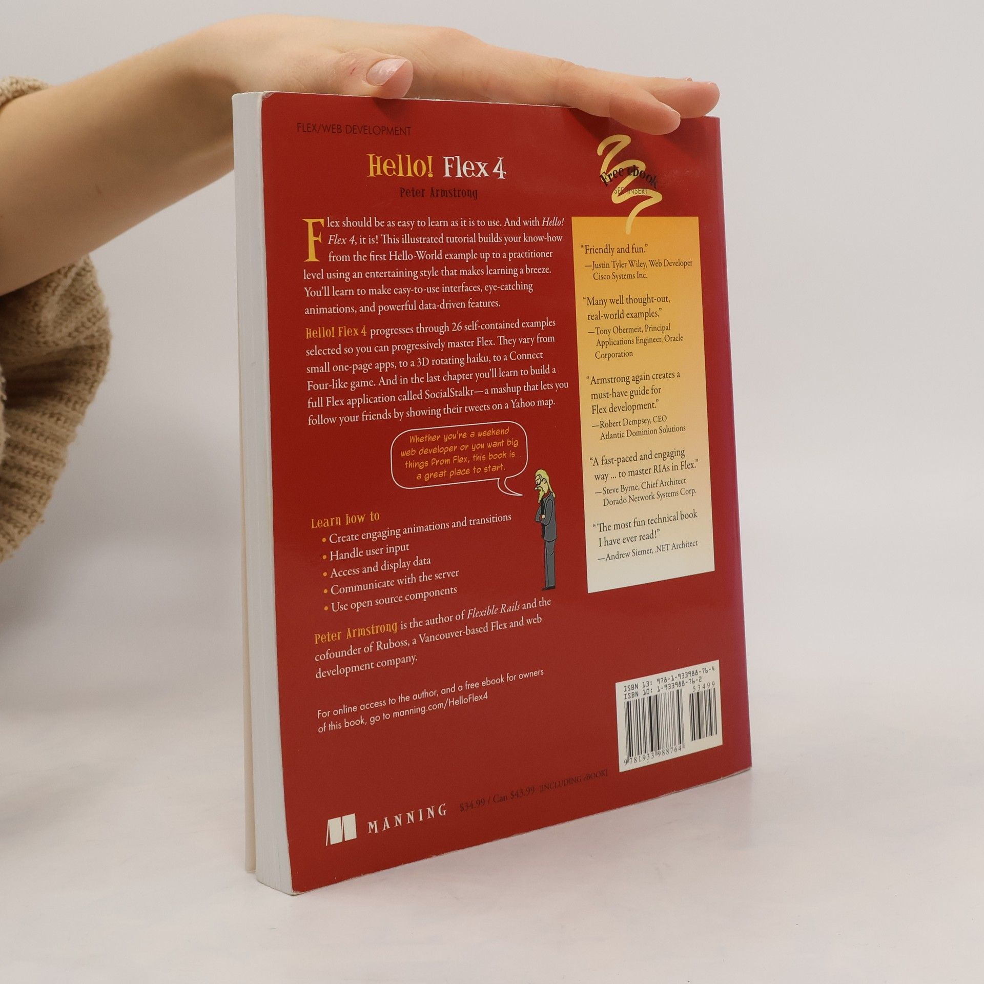 Flex 4 is an open-source tool that allows developers to easily add life to web applications with dynamic user features, colorful transitions, and eye-catching animations. Flex also provides powerful data handling for industrial-strength applications.We think it should be just as much fun to learn Flex as it is to use it. And we know that fun learning gets better results. Hello! Flex 4 demonstrates how to get started without getting bogged down in technical detail or academic edge cases. In this book, User Friendly cartoon characters offer commentary and snide side comments, as the book moves quickly from Hello World into practical techniques. Each one is illustrated with a hands-on example. Along the way, readers will build a unique Flex application that mashes Yahoo Maps with Twitter to keep track of friends.Purchase of the print book comes with an offer of a free PDF, ePub, and Kindle eBook from Manning. Also available is all code from the book.