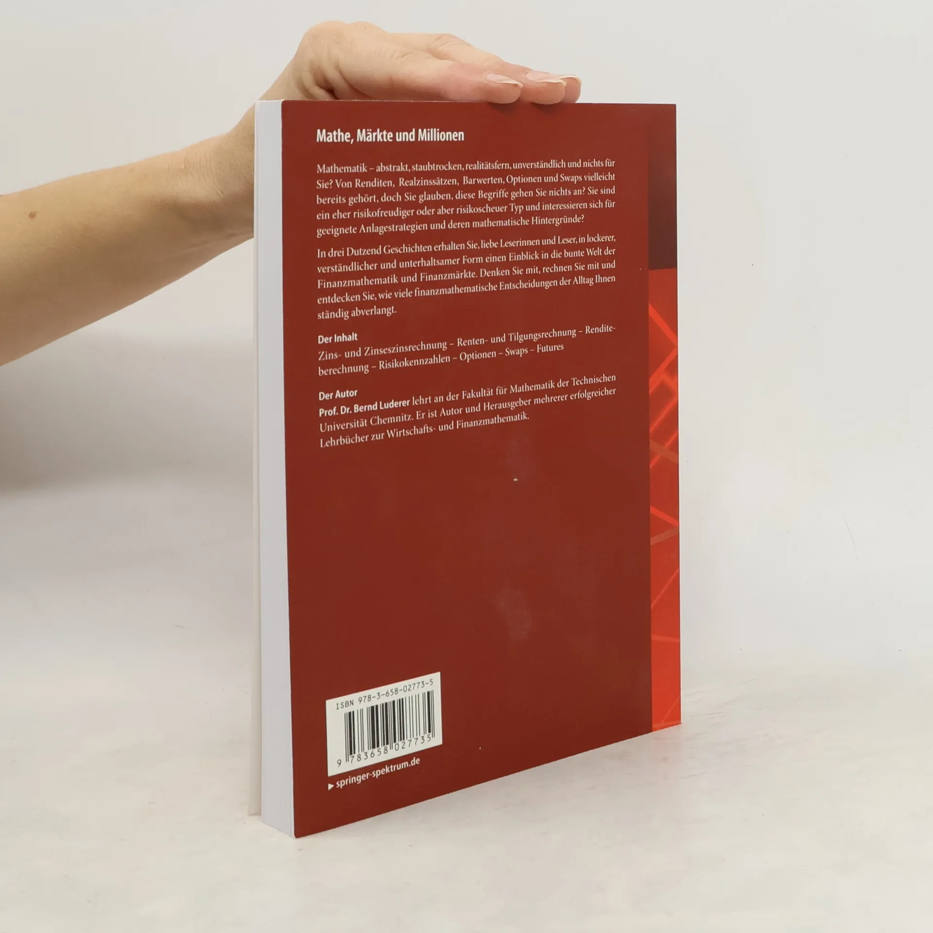Mathematik – abstrakt, staubtrocken, realitätsfern, unverständlich und nichts für Sie? Von Renditen, Realzinssätzen, Barwerten, Optionen und Swaps vielleicht bereits gehört, doch Sie glauben, diese Begriffe gehen Sie nichts an? Sie sind ein eher risikofreudiger oder aber risikoscheuer Typ und interessieren sich für geeignete Anlagestrategien und deren mathematische Hintergründe? In drei Dutzend Geschichten erhalten Sie, liebe Leserinnen und Leser, in lockerer, verständlicher und unterhaltsamer Form einen Einblick in die bunte Welt der Finanzmathematik und Finanzmärkte. Denken Sie mit, rechnen Sie mit und entdecken Sie, wie viele finanzmathematische Entscheidungen der Alltag Ihnen ständig abverlangt.