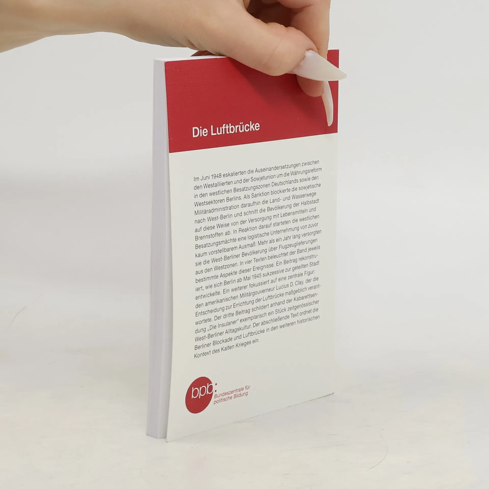 Von Juni 1948 bis September 1949 versorgte die Luftbrücke den Westteil der Stadt Berlin durch Flugzeuge der Alliierten, nachdem die sowjetische Besatzung alle Land- und Wasserwege gesperrt hatte. Dieser Band zeichnet Berlins Weg zur gespaltenen Stadt nach, erinnert an den US-Militärgouverneur General Lucius D. Clay, lässt das legendäre Kabarett "Der Insulaner" wieder aufleben und ordnet die Blockade in den Zusammenhang des Kalten Kriegs ein.