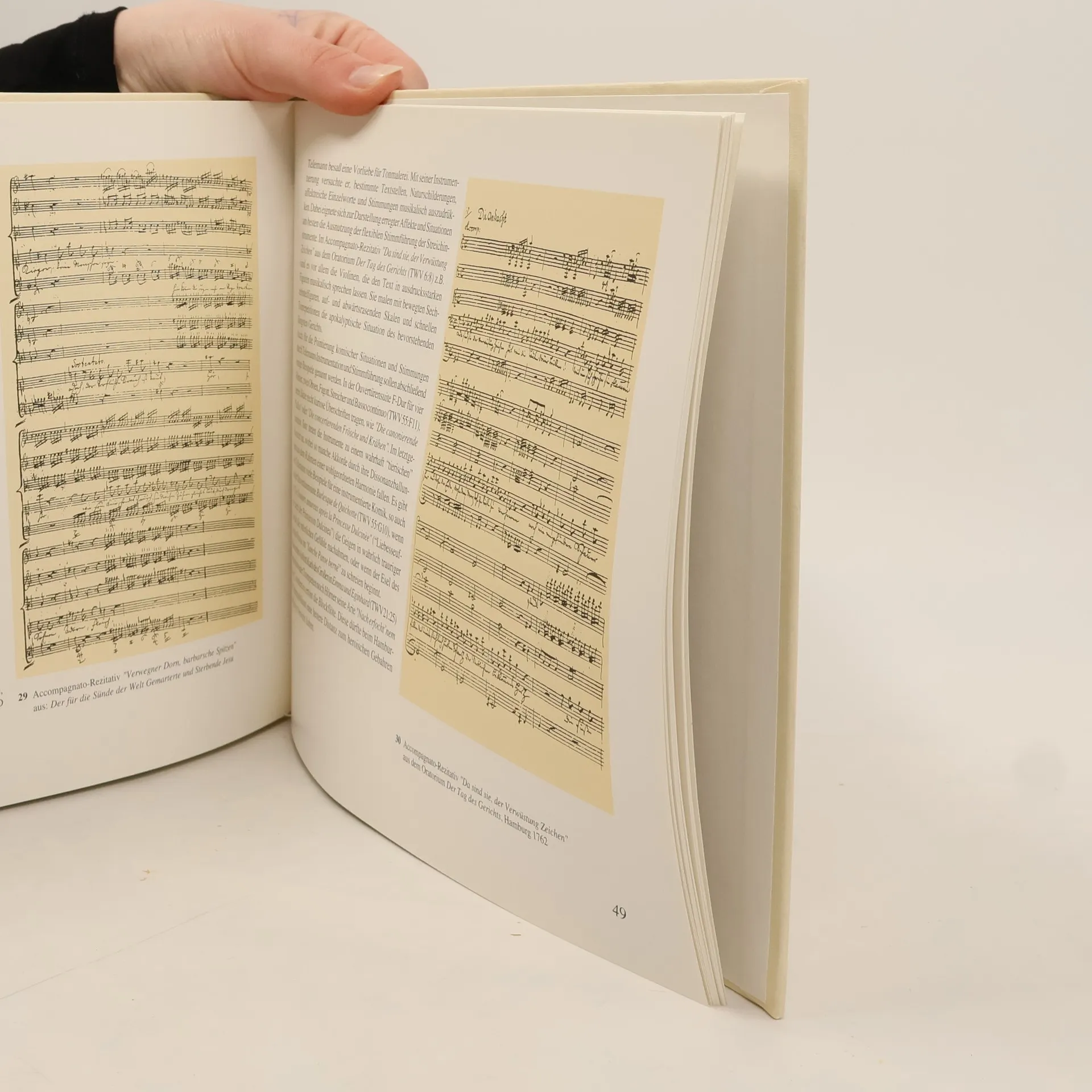 Die Violine wird nach Orgel-Arth tractiret, Die Flöt' und Hautbois Trompeten gleich verspühret, Die Gamba schlentert mit, so wie das Bäßgen geht, Nur daß noch hier und da ein Triller drüber steht. Nein, nein, es ist nicht gnug, daß nur die Noten klingen, Daß du der Reguln Kram zu Marckte weist zu bringen. Gieb jedem Instrument das, was es leyden kan, So hat der Spieler Lust, du hast Vergnügen dran. Georg Philipp Telemann