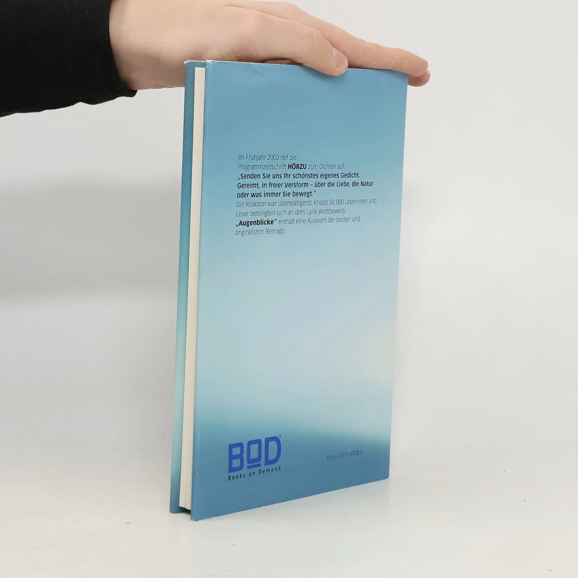Im Frühjar 2003 rief die Programmzeitschrift Hörzu zum Dichten auf: "Senden Sie uns Ihr schönstes eigenes Gedicht. Gereimt, in freier Versoform - über die Liebe, die Natur oder was immer Sie bewegt."Die Reaktion war überwältigend: Knapp 50.000 Leserinnen und Leser beteiligten an dem Lyrik-Wettbewerb."Augenblicke" enthält eine Auswahl der besten und originelsten Beiträge.