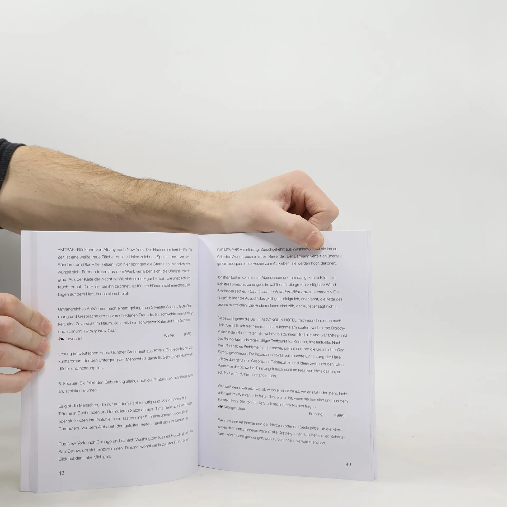 Das Buch besteht aus drei Teilen und umspannt die Jahre 1982-1990. Die Autorin ist verführt von New York, der Magie Manhattans, das in den 80er Jahren zu ihrem Lebensmittelpunkt wird. Die Aufzeichnungen schildern das atemlose wie aufregende Dasein in einer Weltmetropole, dort zu arbeiten und die Schwierigkeiten in einem fremden Land, in einer anderen Sprache, Wurzeln zu fassen. Sie zeigen die Vielfalt der international geprägten Kulturszene. Die Architektur der Stadt beflügelt und überrascht täglich. New York - ein Fest fürs Leben. Ihre Tätigkeit lässt sie zu den wichtigsten amerikanischen Städten reisen. An der Westküste wird die Begegnung mit der letzten Generation jüdisch-deutscher Emigranten zu einer existentiellen Erfahrung. Berliner, einst Bewohner des Tiergarten-Viertels, Dahlems, Vertriebene aus Wien, aus Europa, deren Geschichte, versetzen in eine Zeit, erinnern an eine Kultur, die es in Deutschland seit 1933 nicht mehr gibt. Europa, aus Fernweh verlassen, - bleibt unentbehrlich. Die Reisen zwischen den Kontinenten werden zum Spiegelbild der kulturellen Unterschiede und Lebensweisen. Italien lockt mit der Schönheit der Toskana, dem dramatischen Rom, dem Geheimnis von Olivenhainen und Gärten, den Sehnsuchtsort Venedig. Das Dorf Galilea, in den Bergen Mallorcas, ist ein Rückzugsort. Ägypten dagegen entführt in eine chiffrierte Welt.