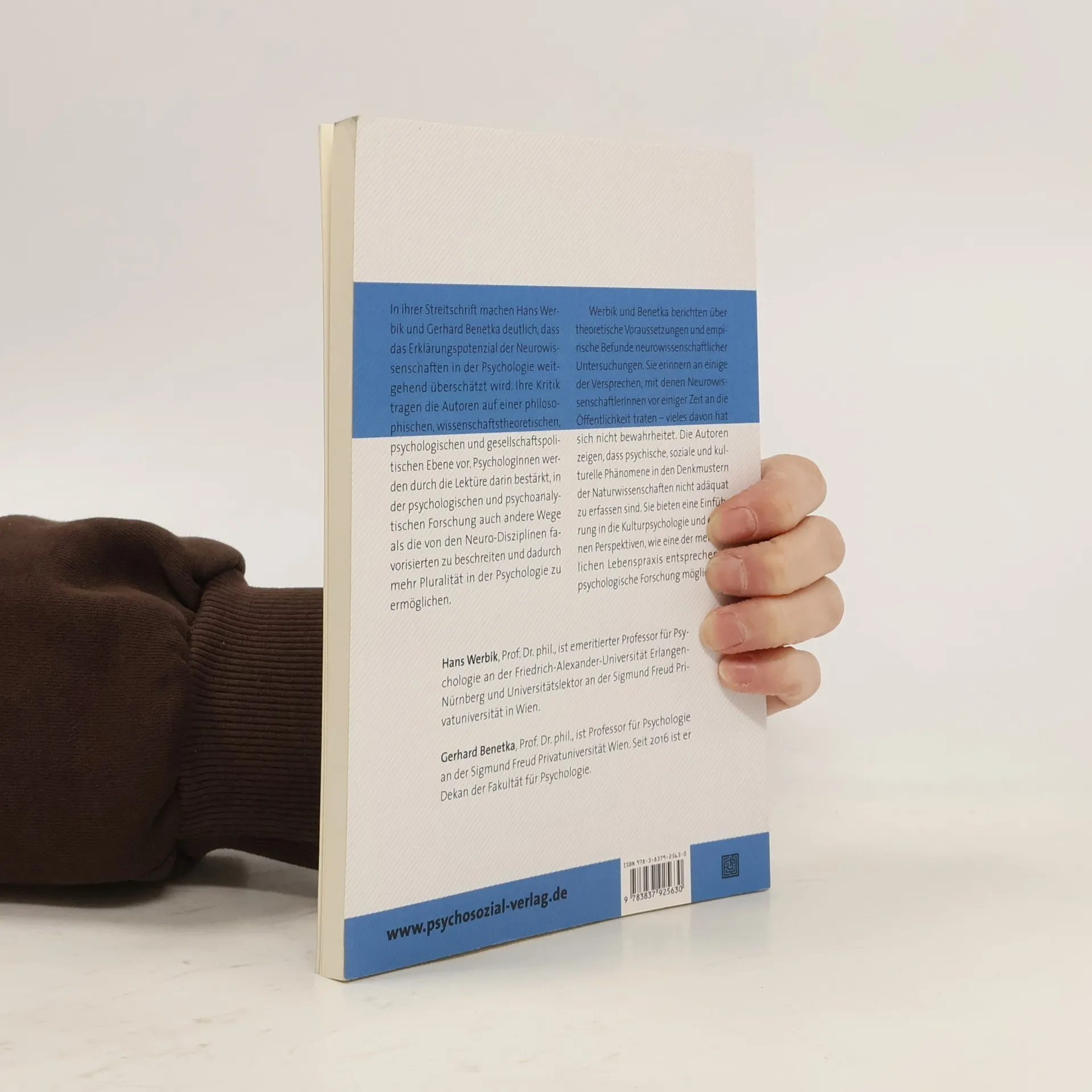 In ihrer Streitschrift machen Hans Werbik und Gerhard Benetka deutlich, dass das Erklärungspotenzial der Neurowissenschaften in der Psychologie weitgehend überschätzt wird. Ihre Kritik tragen die Autoren auf einer philosophischen, wissenschaftstheoretischen, psychologischen und gesellschaftspolitischen Ebene vor. PsychologInnen werden durch die Lektüre darin bestärkt, in der psychologischen und psychoanalytischen Forschung auch andere Wege als die von den Neuro-Disziplinen favorisierten zu beschreiten und dadurch mehr Pluralität in der Psychologie zu ermöglichen. Werbik und Benetka berichten über theoretische Voraussetzungen und empirische Befunde neurowissenschaftlicher Untersuchungen. Sie erinnern an einige der Versprechen, mit denen NeurowissenschaftlerInnen vor einiger Zeit an die Öffentlichkeit traten – vieles davon hat sich nicht bewahrheitet. Die Autoren zeigen, dass psychische, soziale und kulturelle Phänomene in den Denkmustern der Naturwissenschaften nicht adäquat zu erfassen sind. Sie bieten eine Einführung in die Kulturpsychologie und eröffnen Perspektiven, wie eine der menschlichen Lebenspraxis entsprechende psychologische Forschung möglich ist.