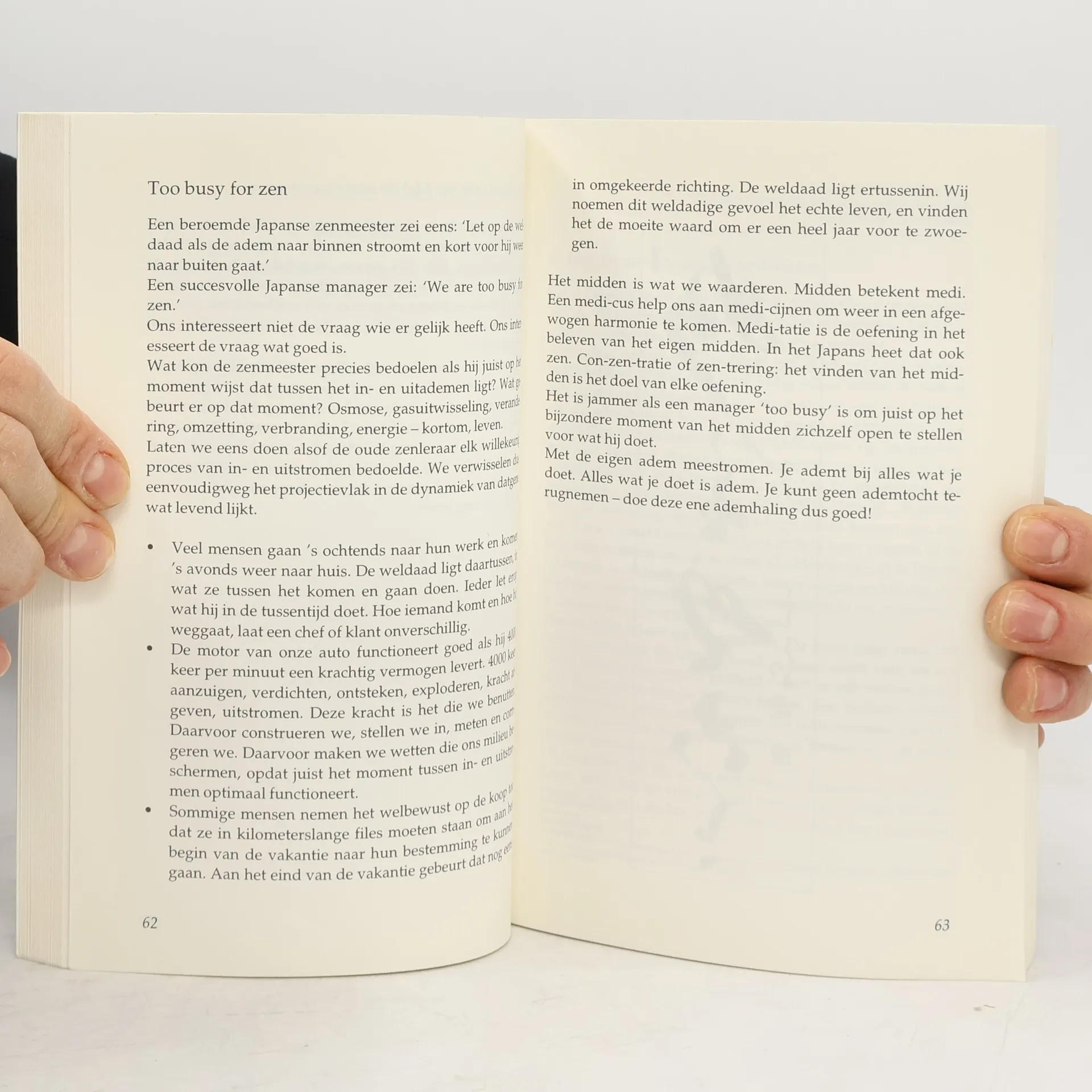 Niet voor niets zenden Japanse ondernemers hun leidinggevend personeel naar zenkloosters. De omzetting van het zenprincipe naar de managementpraktijk van alledag is immers buitengewoon succesvol gebleken. Veel uit Japan stammende management- en productietechnieken zoals Kaizen, Kaban en Leanes hebben een zenachtergrond. De geest van zen is moeilijk te verklaren aan rationeel ingestelde westerlingen. De zenervaring ligt vooral op het intuïtieve terrein. Toch slagen de auteurs er in de basisprincipes van zen helder te maken en om te zetten in technieken die de westerling kan benutten in het bedrijfsleven. Een boek waar men op zit te wachten, zeker buiten zenkringen. Het bevat vele citaten van oude tot nieuwe zenmeesters, maar is tevens zeer praktisch van opzet. Het bijzondere van dit boek is de link die de auteurs weten te leggen tussen de oude oerbronnen van zen en het moderne bedrijfsleven. Juist de hier-is-nu-gedachte (die tot daadkracht leidt) werpt vruchten af in managementkringen. Het boek bevat oefeningen en zazenmeditaties en is voorzien van schitterende illustraties.