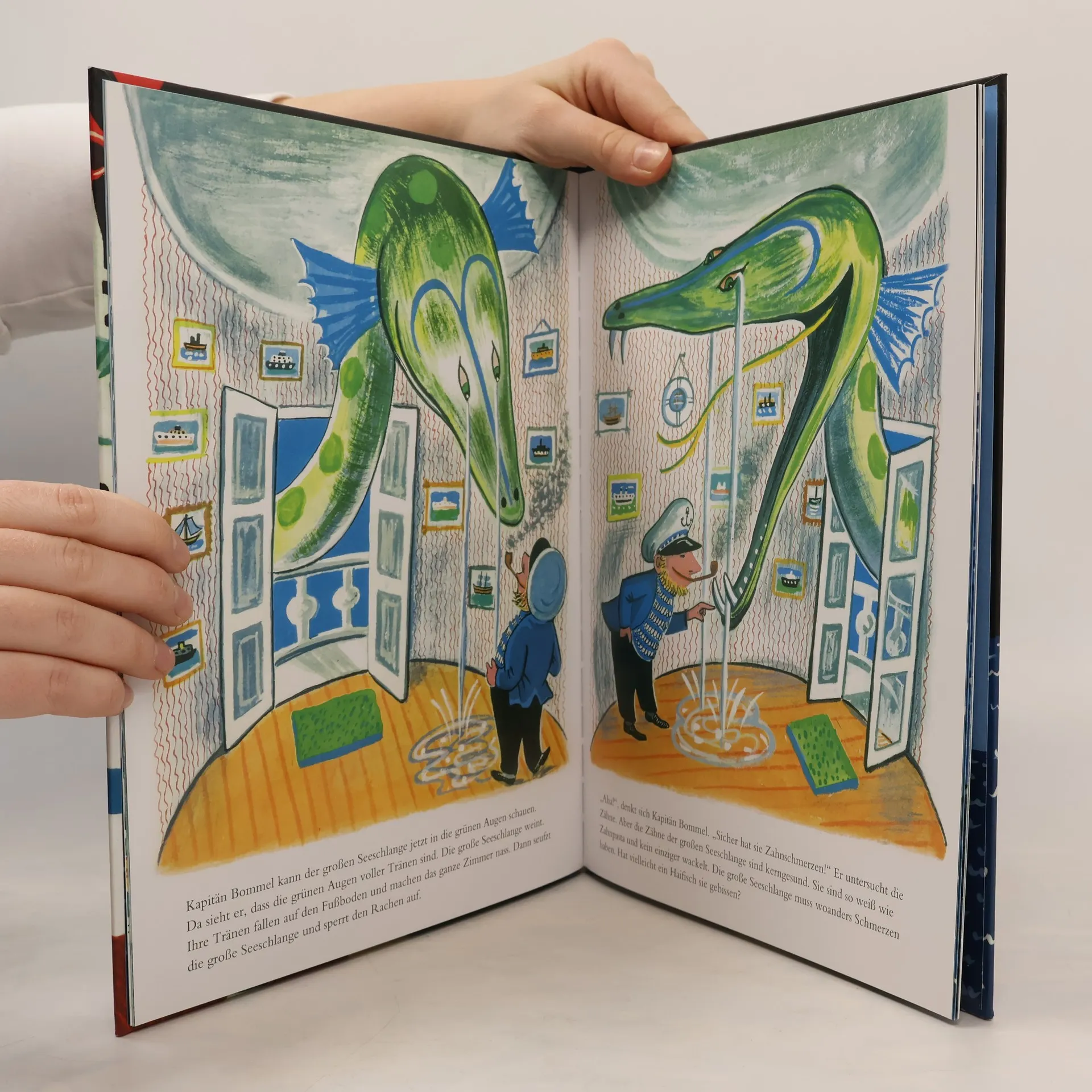 Der Bilderbuchklassiker aus den 60er-Jahren ist wieder da! Kapitän Bommel hat schon vieles gesehen, aber eine Seeschlange – „mindestens so lang wie fünf Eisenbahnzüge" – ist ihm bislang noch nicht ins Netz gegangen. Von Anfang an kann Kapitän Bommel die Seeschlange nicht leiden. Sie bringt alles durcheinander und macht allen Menschen, die auf den Schiffen übers Meer fahren, große Angst. Doch eines Tages benimmt sie sich anders als sonst ... „Kapitän Bommel" zählt zu den Lieblingsbilderbüchern von Cornelia Funke und wird in ihrem Roman „Tintenherz" sogar namentlich erwähnt. Für Kinder ab 4 Jahren geeignet.